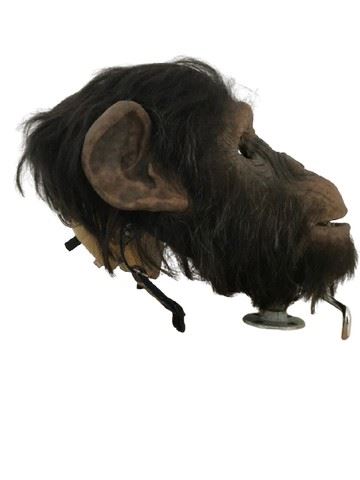 Ed (1996) - This remarkable animatronic chimpanzee head/mask, was crafted by the renowned AnimatedFX, Inc., and used as a special effects mask for stunt scenes in the film Ed. It is made with radio controlled facial mechanics, a snug fitting fiberglass skullcap, and painted silicone skin with hand punched human hair. The head offers a captivating blend of realism and historical significance. Its hyper-realistic detail brings the creature to life with astonishing authenticity. The movable jaw, complete with a latex tongue, gums, and resin teeth, allows for expressive animations that add depth and character to any performance.