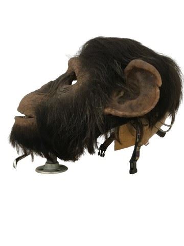 Ed (1996) - This remarkable animatronic chimpanzee head/mask, was crafted by the renowned AnimatedFX, Inc., and used as a special effects mask for stunt scenes in the film Ed. It is made with radio controlled facial mechanics, a snug fitting fiberglass skullcap, and painted silicone skin with hand punched human hair. The head offers a captivating blend of realism and historical significance. Its hyper-realistic detail brings the creature to life with astonishing authenticity. The movable jaw, complete with a latex tongue, gums, and resin teeth, allows for expressive animations that add depth and character to any performance.