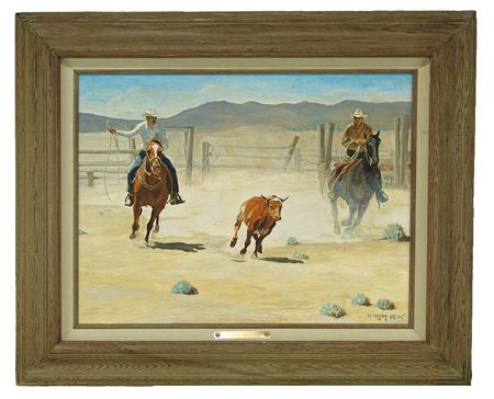 Circa 1981, Excellent oil on board titled "The Bailin' Wire Corral" depicting typical cowboy scene of ropers. Matted and framed. 18" x 24" (26" x 32")