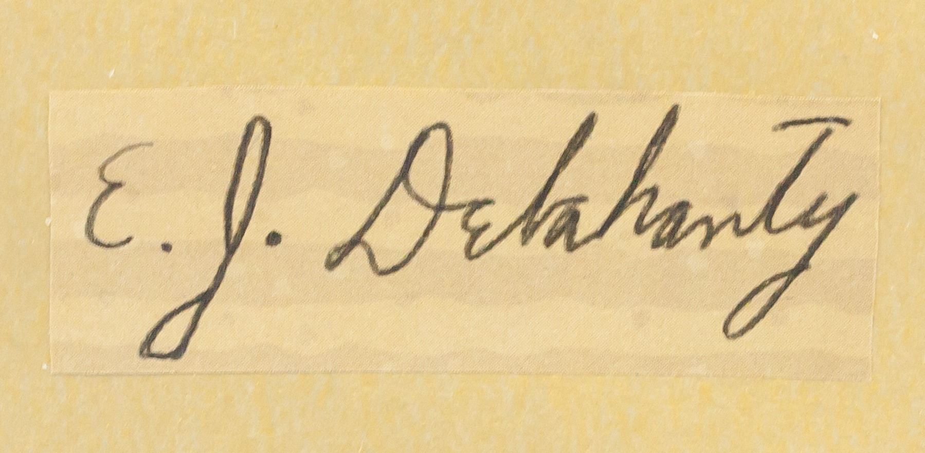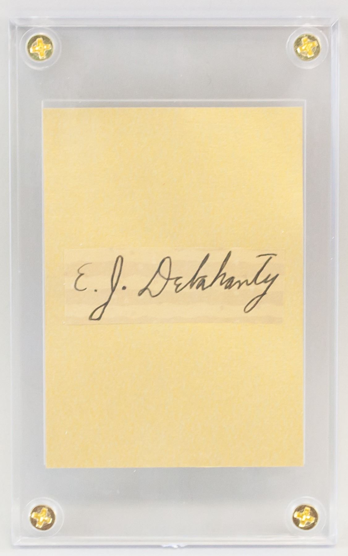 Ed Delahanty autograph pressed between glass. Accompanied with Certificate of Authenticity. Edward James Delahanty, nicknamed "Big Ed", was an American professional baseball player, who spent his Major League Baseball playing career with the Philadelphia Quakers, Cleveland Infants, Philadelphia Phillies, and Washington Senators. 2 x 5.9 cm, case size: 13 x 8 cm. Photograph is not included in the lot.