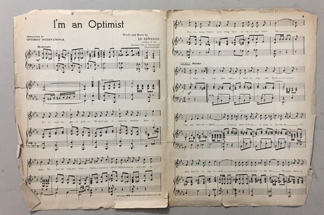 Autographed sheet music cover page from "I'm an Optimist" by Ed Edwards. Sheet music is also included, produced by Optimist International, Railway Exchange Building, St. Louis, MO
