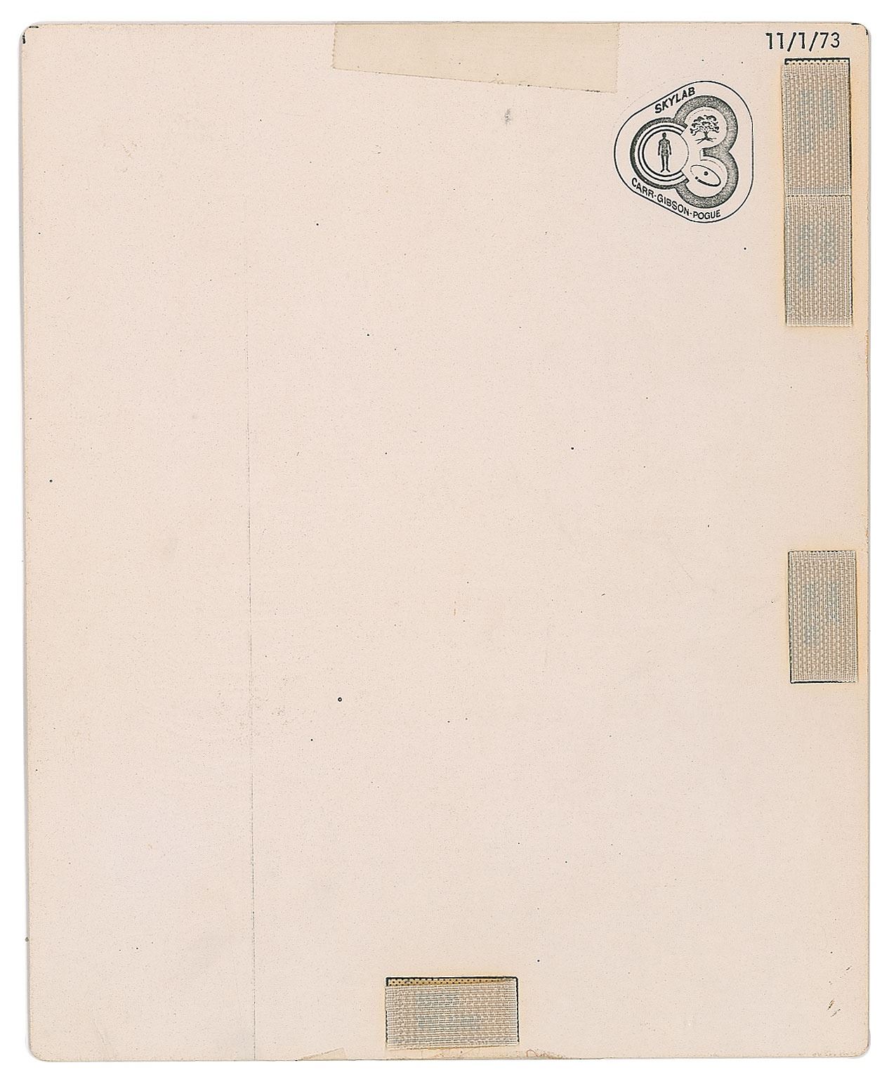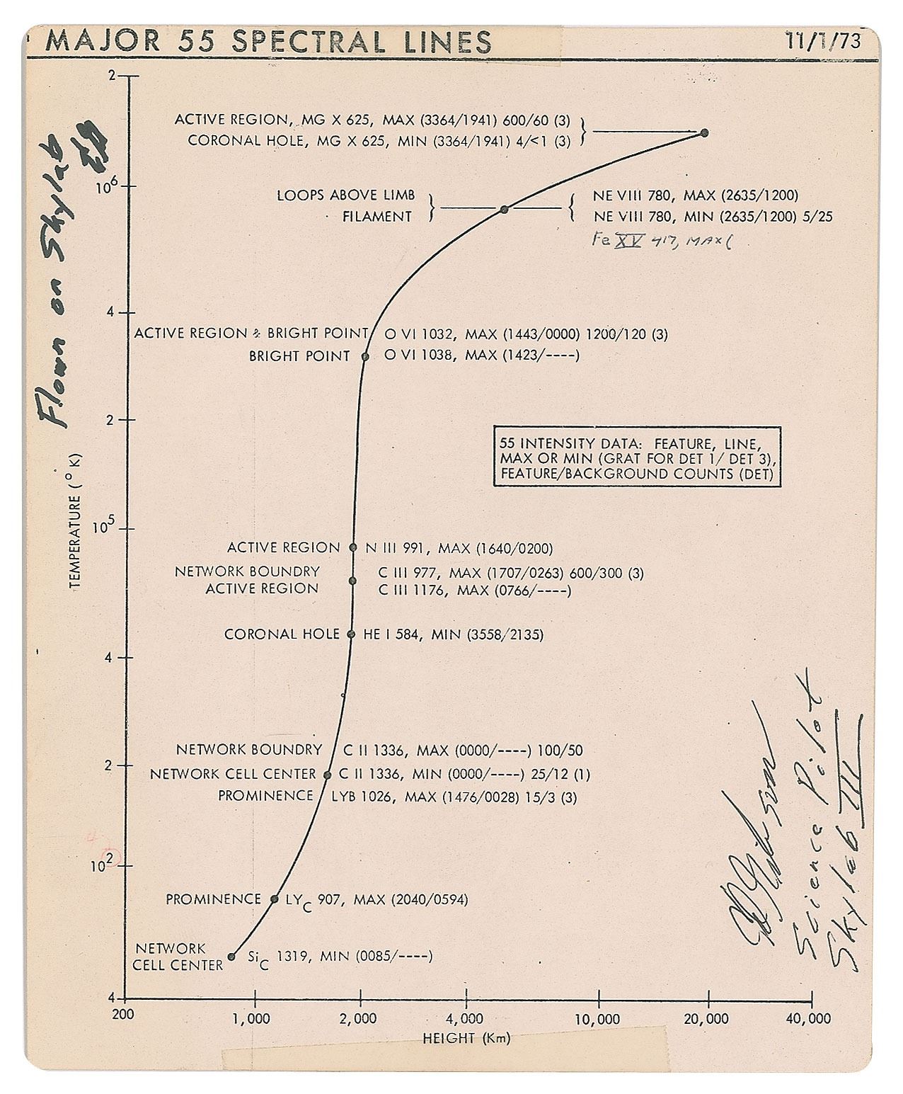 Single-sided cue card flown on the Skylab 3 (SL-4) mission, 6.5 x 8, signed and flight-certified along the edge in black felt tip by Science Pilot Ed Gibson, "Flown on Skylab, Ed," and signed in the corner, "Ed Gibson, Science Pilot, Skylab III." The cue card is headed "Major 55 Spectral Lines" and charts temperature against height. The back features four small Velcro tabs and is imprinted with the Skylab 3 insignia. In fine condition, with small pieces of tape at the top and bottom.