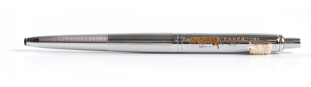 Flown metal-bodied Fisher AG7 Space Pen carried into space on the Skylab 4 mission, measuring 5? long, engraved with NASA part numbers “P/N SEB12100051-208, S/N 1267.” A small swatch of Velcro is affixed to the top. In fine condition, with some toned adhesive remnants to the body. Accompanied by a photocopied letter of provenance from Ed Gibson, stating that the pen flew on Skylab.