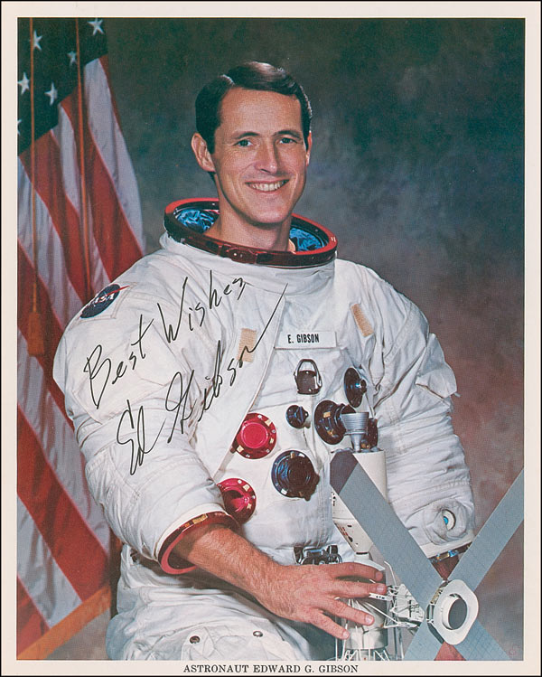 Color 8 x 10 NASA photo of Gibson holding a model of Skylab, signed in black felt tip, “Best wishes, Ed Gibson.” In fine condition, with a light paperclip impression to top edge.
