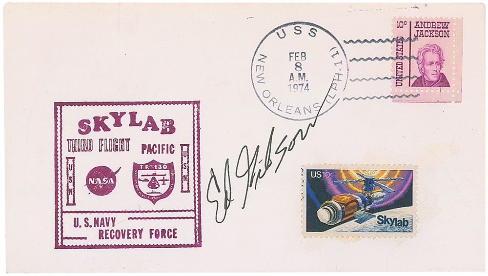 Skylab recovery cover with a cachet honoring the third flight’s naval recovery force, signed in black ink by Gibson. In fine condition.