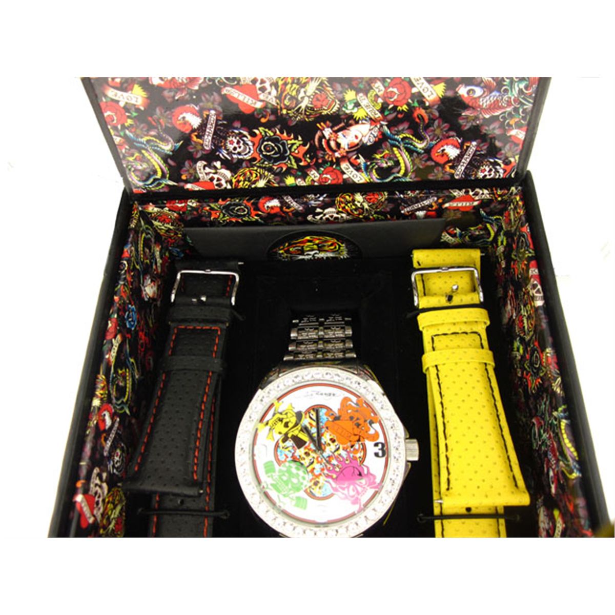 This is an Ed Hard Ed Hardy AC-MN Ace Interchangeable Steel Bracelet and Leather Bands Watch with the following features:  Stainless steel Bracelet with 2 interchangeable leather straps; Swarovski crystals; Stainless steel case; Scratch resistant mineral crystal; Quartz movement; and 55 mm Case diameter.