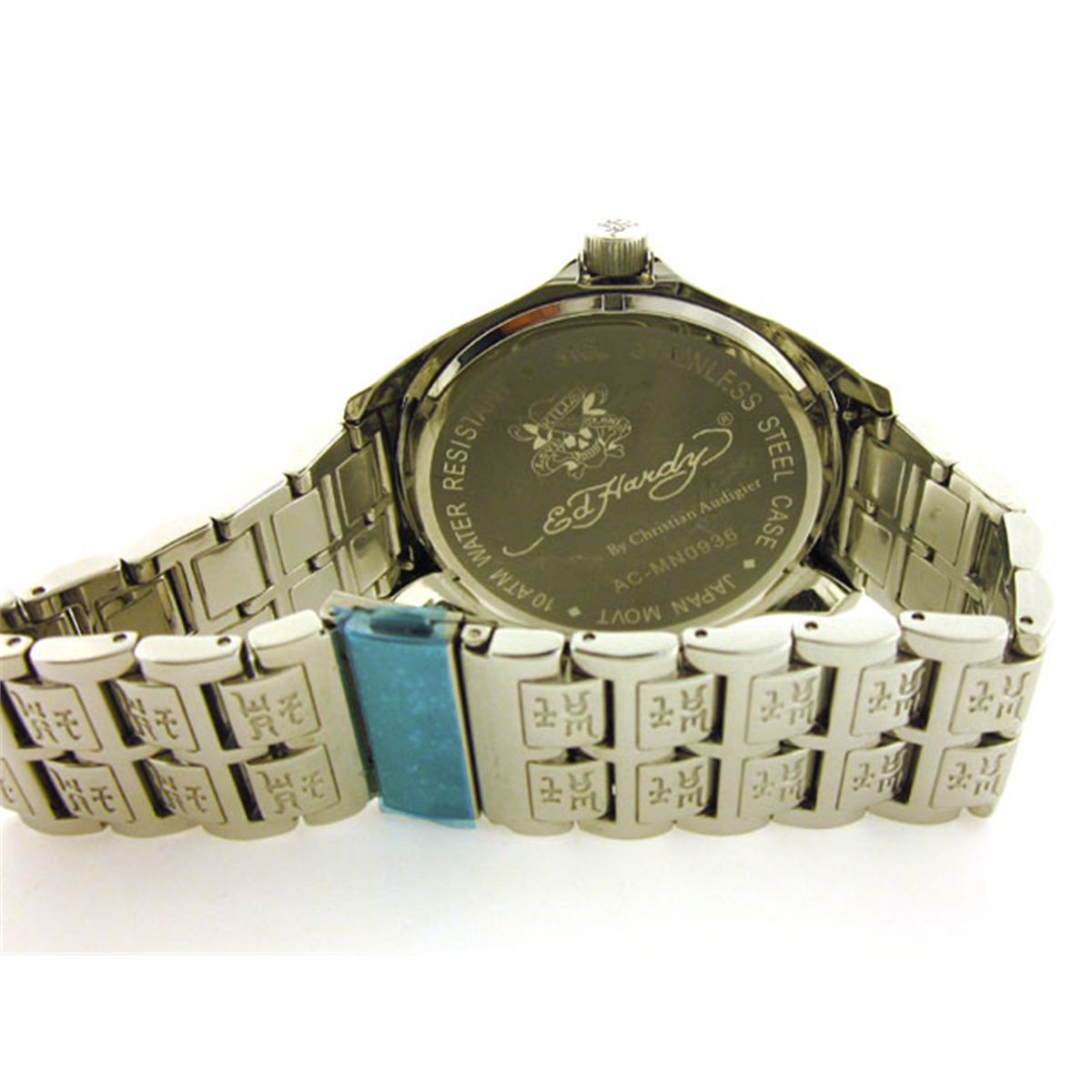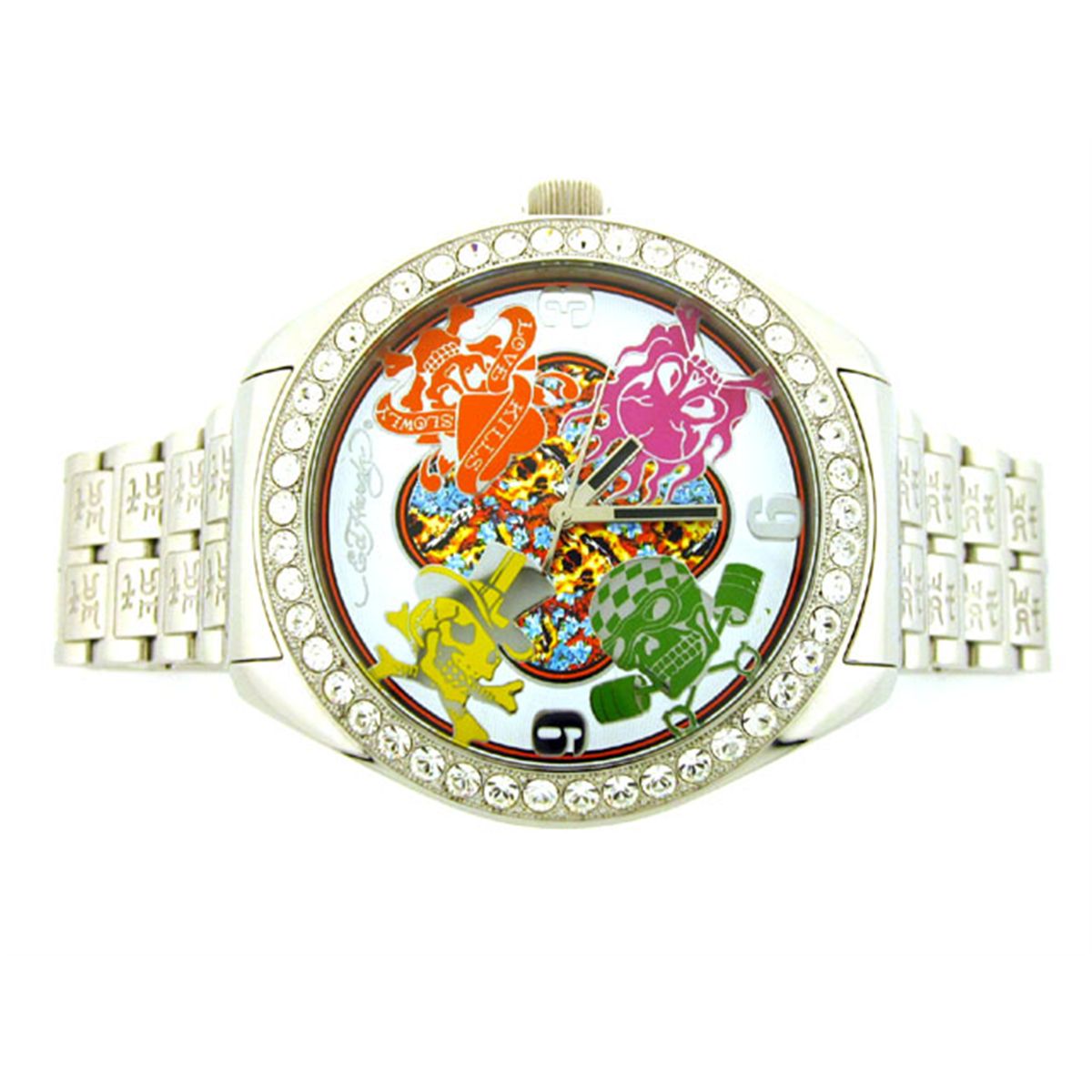 This is an Ed Hardy watch with the following features: 55 mm Case Diameter; Stainless Steel Case; Scratch resistant mineral crystal; Stainless Steel Bracelet; and Quartz movement