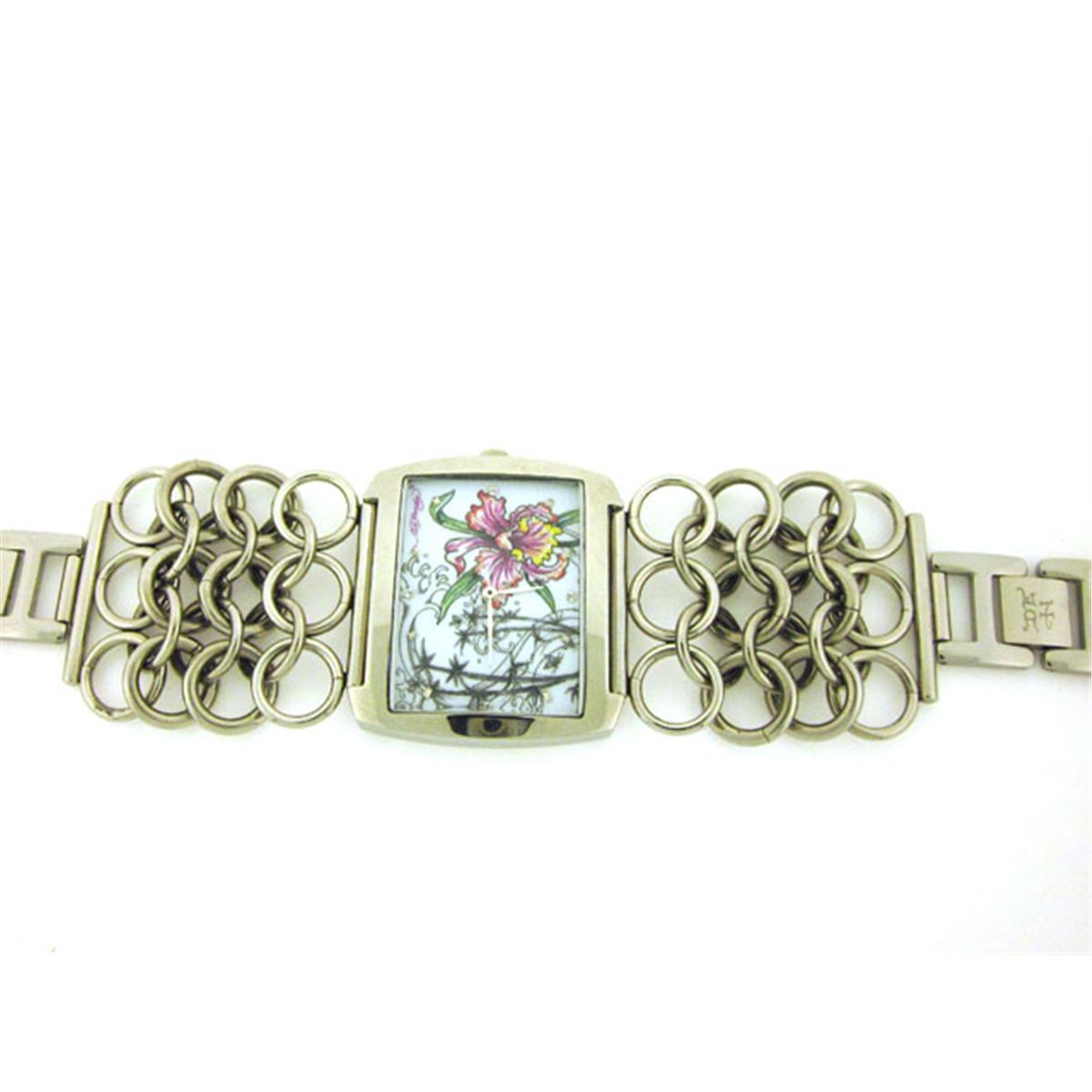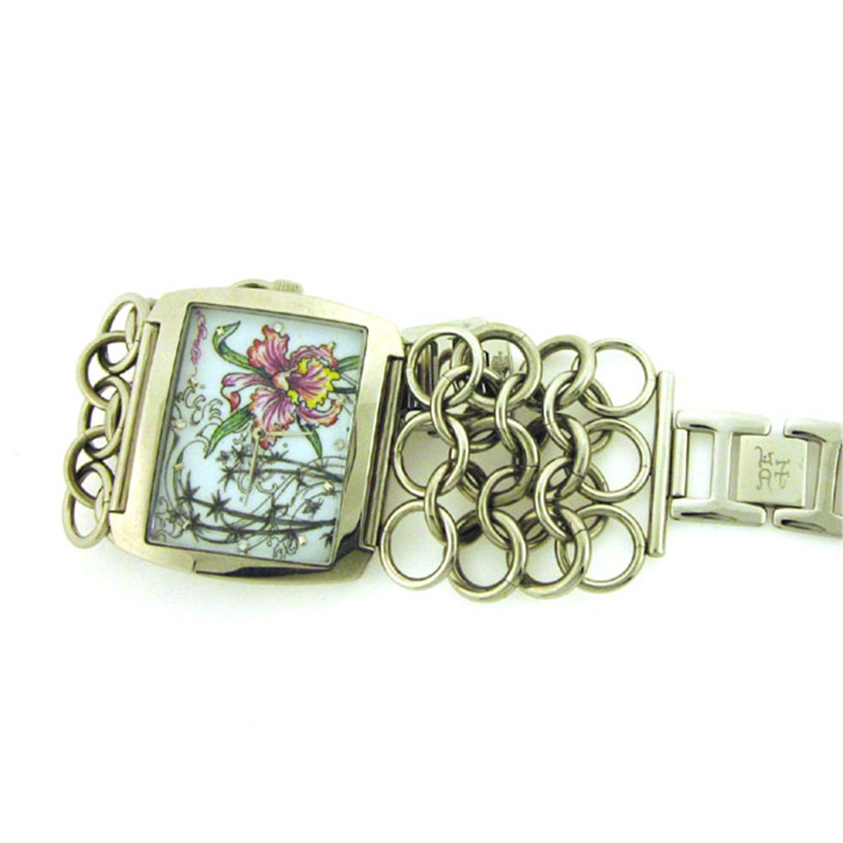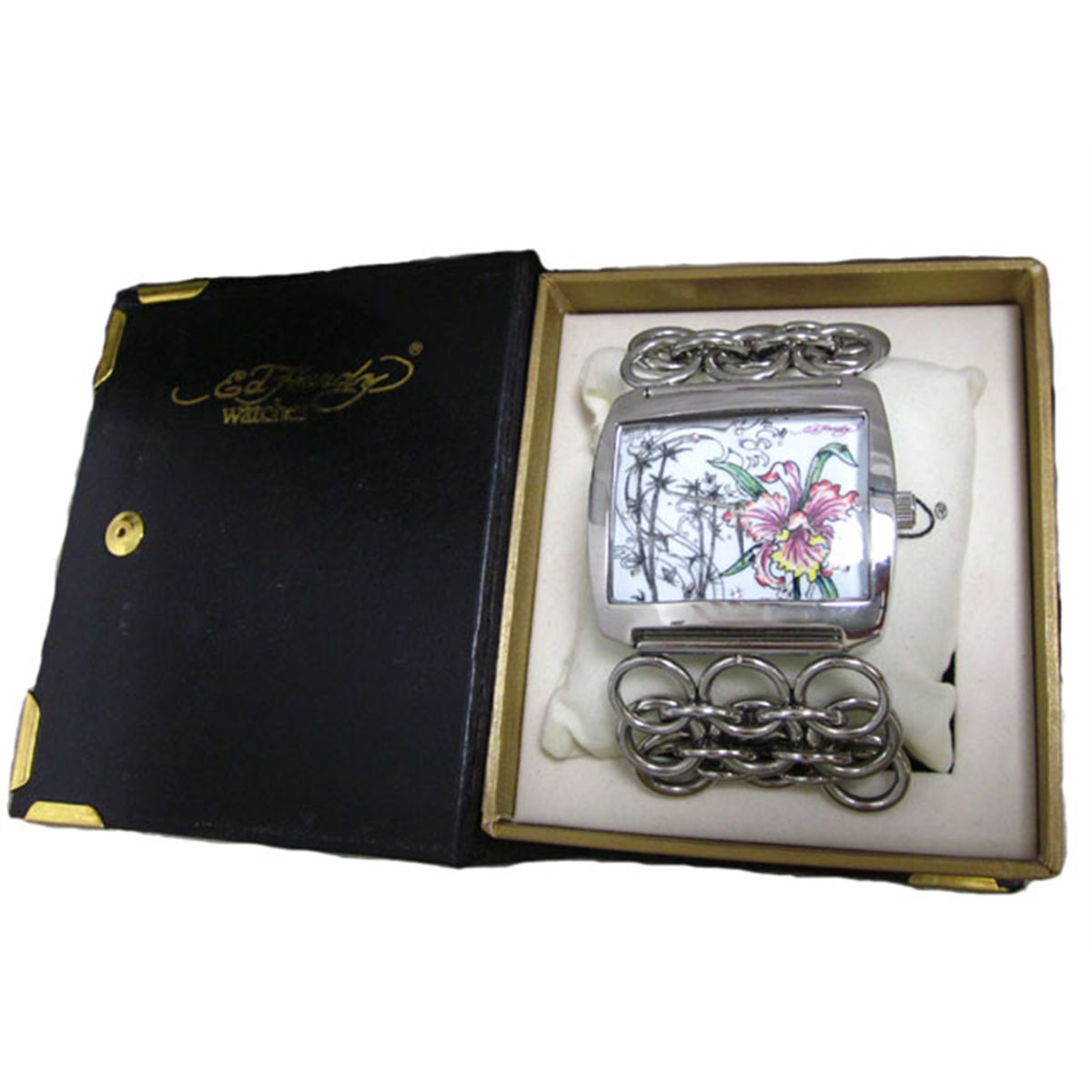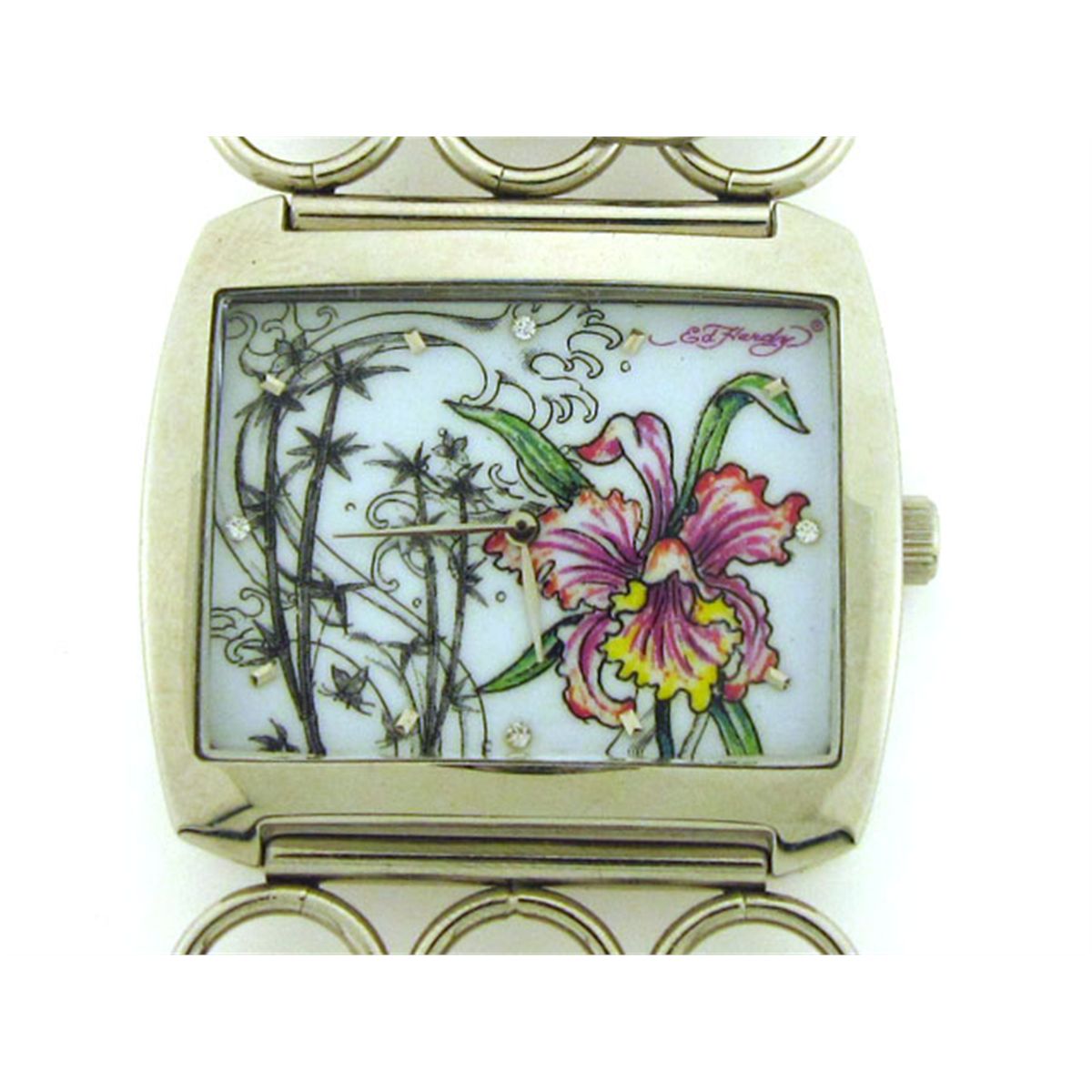 This is an Ed Hardy Ladies' Lynx Orchid Watch (Model: LY-OR) with the following features: Casual style; Stainless steel case; White dial; Jewelry clasp; Quartz movement; Mineral crystal; 45 mm Case diameter; and Water resistant