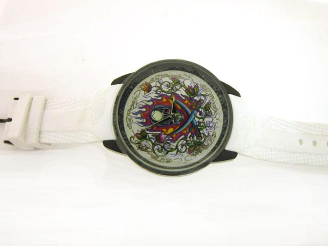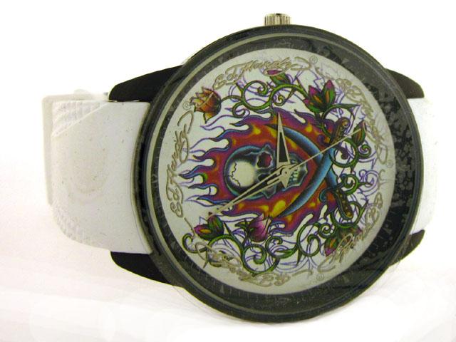 This is a Ed Hardy Men's AU-FS Autometer Flaming Skull Watch with the following features: Stainless steel case; Hardened mineral dial; Buckle clasp; 45 mm case diameter; 10 mm case thickness; rubber band; 20 mm bad width; white band; white dial; ion-plated black bezel; stationary bezel function; japanese quartz movement; and water resistant.