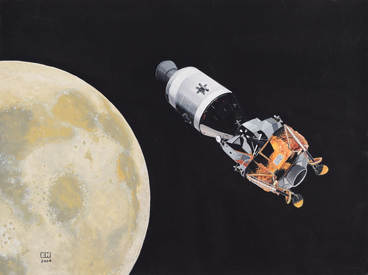 Original color painting by renowned space artist Ed Hengeveld entitled 'Translunar Coast,' gouache on paper, 15.75 x 11.75, which depicts an Apollo spacecraft with docked command and lunar modules preparing to separate for lunar descent. Signed and dated in the lower left by the artist, "EH 2006." In very fine condition.