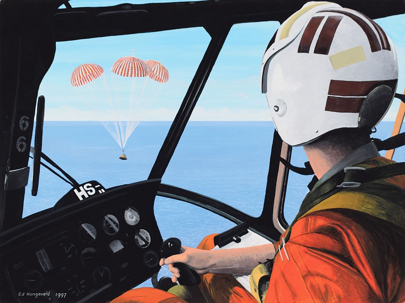 Original color painting by renowned space artist Ed Hengeveld entitled 'Back from the Moon,' gouache on paper, 15.75 x 11.75, which depicts a helicopter recovery pilot watching an Apollo command module parachuting to the ocean surface. Signed and dated in the lower left by the artist, "Ed Hengeveld 1997." In very fine condition.
