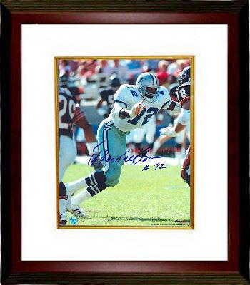 Ed "Too Tall" Jones is a former player in the National Football League for the Dallas Cowboys. By the end of his 15 years with the Cowboys, he was officially credited with 57 quarterback sacks. Unofficially, his career sack total is 106 (sacks did not become an official NFL statistic until 1982). His highest single-season sack total was 13 (in 1985). He was a member of the famed "Doomsday Defense" squad of the 1970s. Jones was given the nickname "Too Tall" because of his height, 6 ft 9 in. Ed Jones has hand autographed this Dallas Cowboys 8x10 Photo with Too Tall Inscription. Certificate of Authenticity from Athlon Sports Collectibles. Custom White Mat and Premium Mahogany Color Framed as shown.