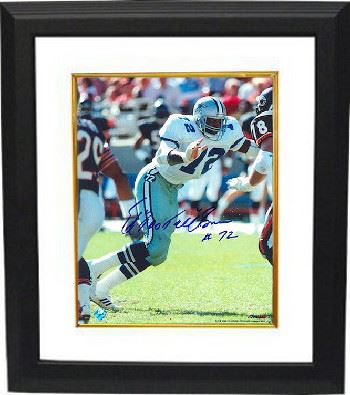 Ed "Too Tall" Jones is a former player in the National Football League for the Dallas Cowboys. By the end of his 15 years with the Cowboys, he was officially credited with 57 quarterback sacks. Unofficially, his career sack total is 106 (sacks did not become an official NFL statistic until 1982). His highest single-season sack total was 13 (in 1985). He was a member of the famed "Doomsday Defense" squad of the 1970s. Jones was given the nickname "Too Tall" because of his height, 6 ft 9 in. Ed Jones has hand autographed this Dallas Cowboys 8x10 Photo with Too Tall Inscription. Certificate of Authenticity from Athlon Sports Collectibles. Custom White Mat and Premium Black Color Framed as shown.