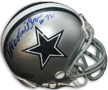 Ed "Too Tall" Jones is a former player in the National Football League for the Dallas Cowboys. By the end of his 15 years with the Cowboys, he was officially credited with 57 quarterback sacks. Unofficially, his career sack total is 106 (sacks did not become an official NFL statistic until 1982). His highest single-season sack total was 13 (in 1985). He was a member of the famed "Doomsday Defense" squad of the 1970s. Jones was given the nickname "Too Tall" because of his height, 6 ft 9 in. Ed Jones has hand autographed this Dallas Cowboys Mini Helmet with Too Tall Inscription. Certificate of Authenticity from Athlon Sports Collectibles.