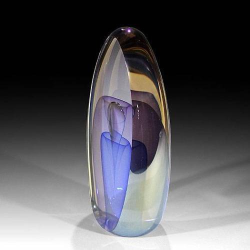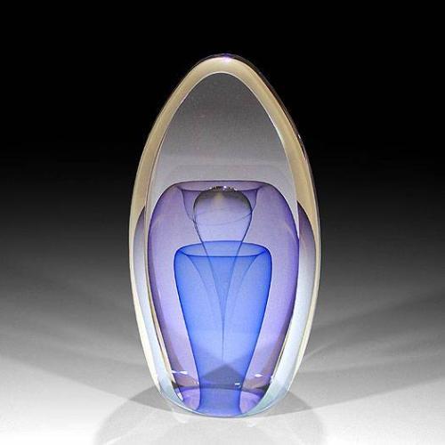 Ed Kachurik Glass Art 2005 "Eternal Flame" veiled abstract design paperweight. A high-domed piece, with a large bubble between blue and amethyst veils. Front and back panel facet. Signed/dated. Height 6".