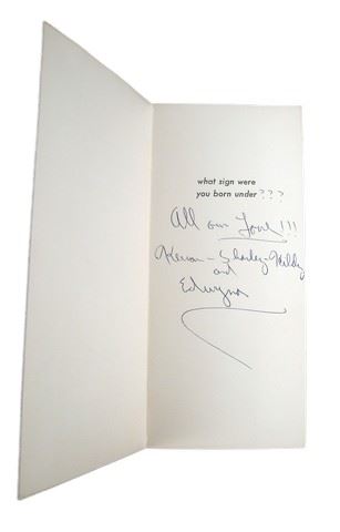 It was no secret that legendary actor/comedian Ed Wynn and his equally famous actor son Kennan had a strong love-hate relationship (leading on the "hate"). Both had a drinking problem. And this was true of Kennan’s close friend superstar Van Johnson. In fact their families intertwined when Kennan’s wife Evie left him for Van. However, they still remain friends. This is a very unusual card. It shows a drunk woman who has fallen on the street of a skid row, with a liquor bottle next to her, under a sign for a flea bit dollar-a-night hotel. Inside is written: “What sign were you born under?” A dark humored card that Kennan and Ed gave to Van, since all three had their fight with alcohol. However they were all known to be open about their affliction, and tried to work through it with humor. What makes this card even more collectable and rare is the fact that it is signed by both Kennan Wynn and Ed Wynn. Their relationship was at best rocky and at worse extremely combative, filled with deep rooted jealousy. it came to a head famously in the first live drama ever produced, Rod Serling's "Requiem For A Heavyweight" (1956), in which both were cast, however Kennan was so terrified that he father would blow his lines on live TV that they had another actor waiting in the wings to take over. The situation was became such a cause célèbre throughout the Industry that another production was made a few years later called "The Man In the Funny Suit" (196), starring both Wynn's playing themselves with shocking raw honesty. So for both of them to be together, and sign this card, (with a handwritten “All our love!!!”) is rare indeed. Obviously this meant a great deal to Van Johnson, who kept it all these years. Comes from Van Johnson’s personal collection, and includes a Letter of Provenience from the Johnson’s daughter, Schuyler Johnson along with a copy of her famous controversial cover story article “My Life As A Hollywood Princess”, about her trials and tribulations growing up in Beverly Hills with a superstar father and extended “family” with some of the most famous celebrities in the world.