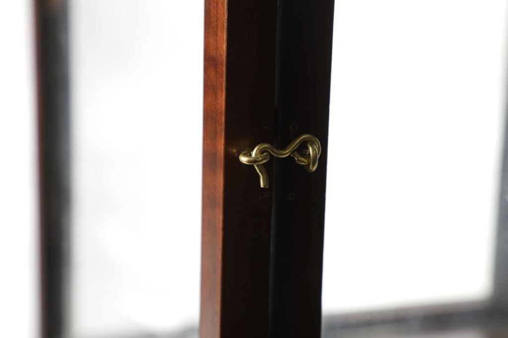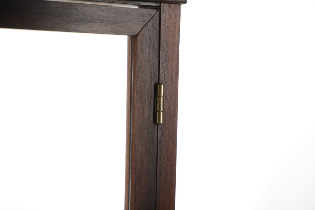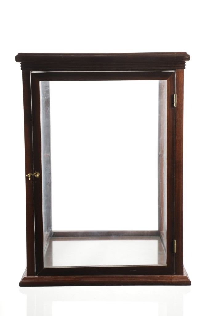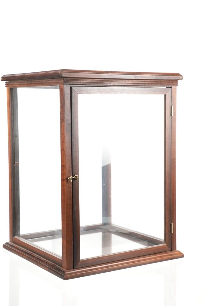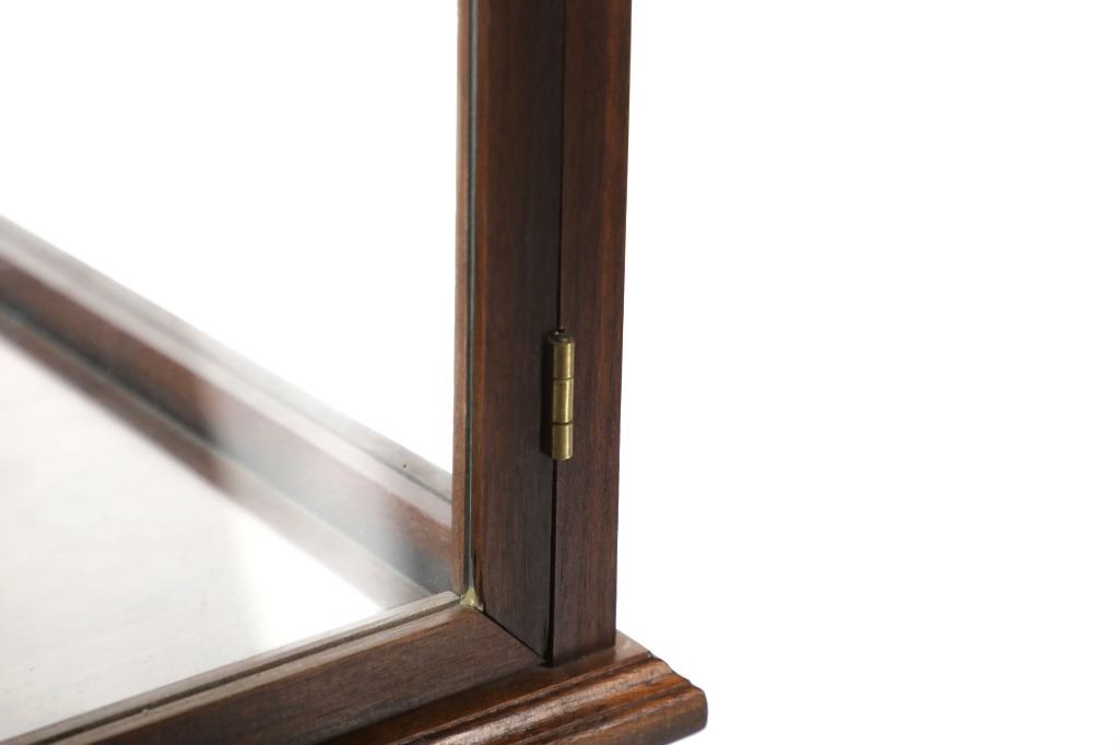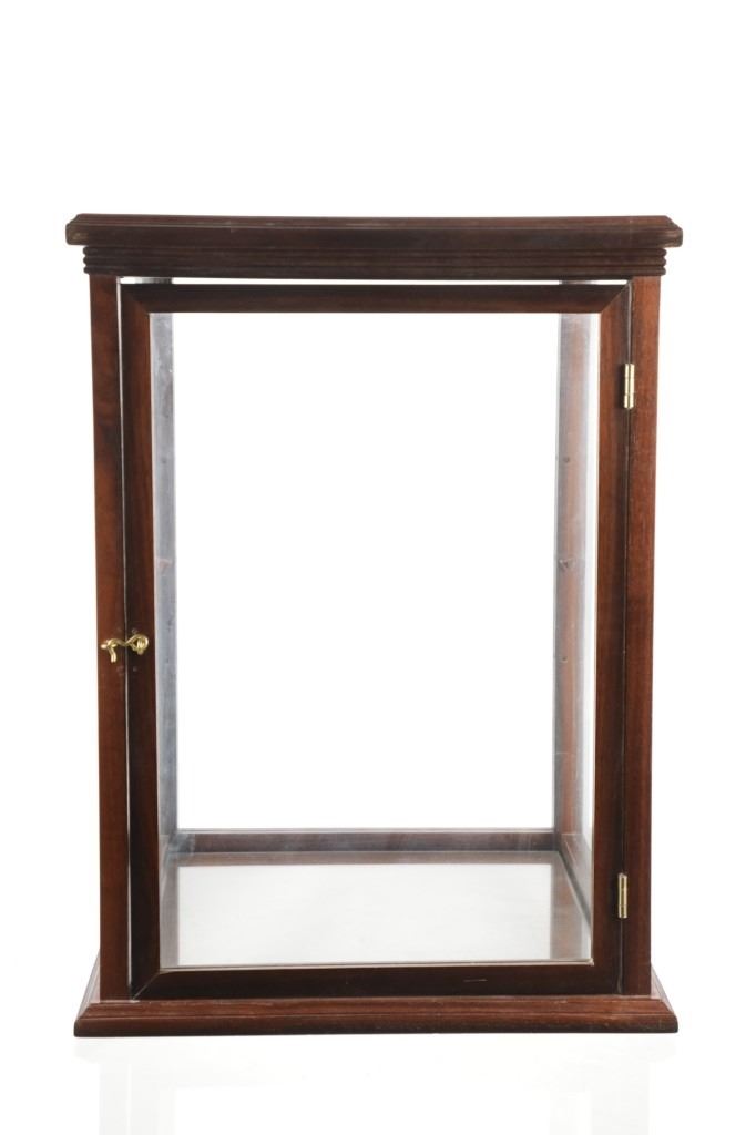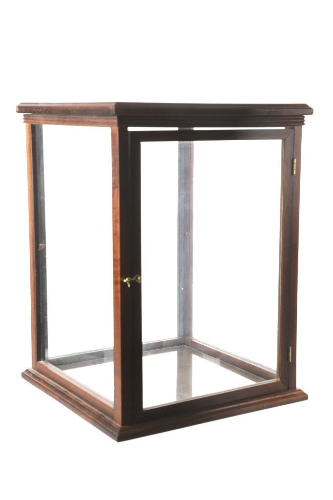 Featured in this lot is this mahogany curio doll display case handcrafted by Ed McCabe circa 1963. The display case features a wonderfully and professionally crafted mahogany, and glass construction that shows a tall case for a doll with a removable glass shelf. The door features a brass clasp and the bottom of the display is marked as follows: Handcrafted by Ed McCabe - Est. 1963. The condition of this curio doll display is well preserved with the no obvious signs of damage and shows a well preserved overall condition. The measurements of this display is 19 1/2" x 14 1/4" x 14 1/4". The collective weight of this display case is 19lb.