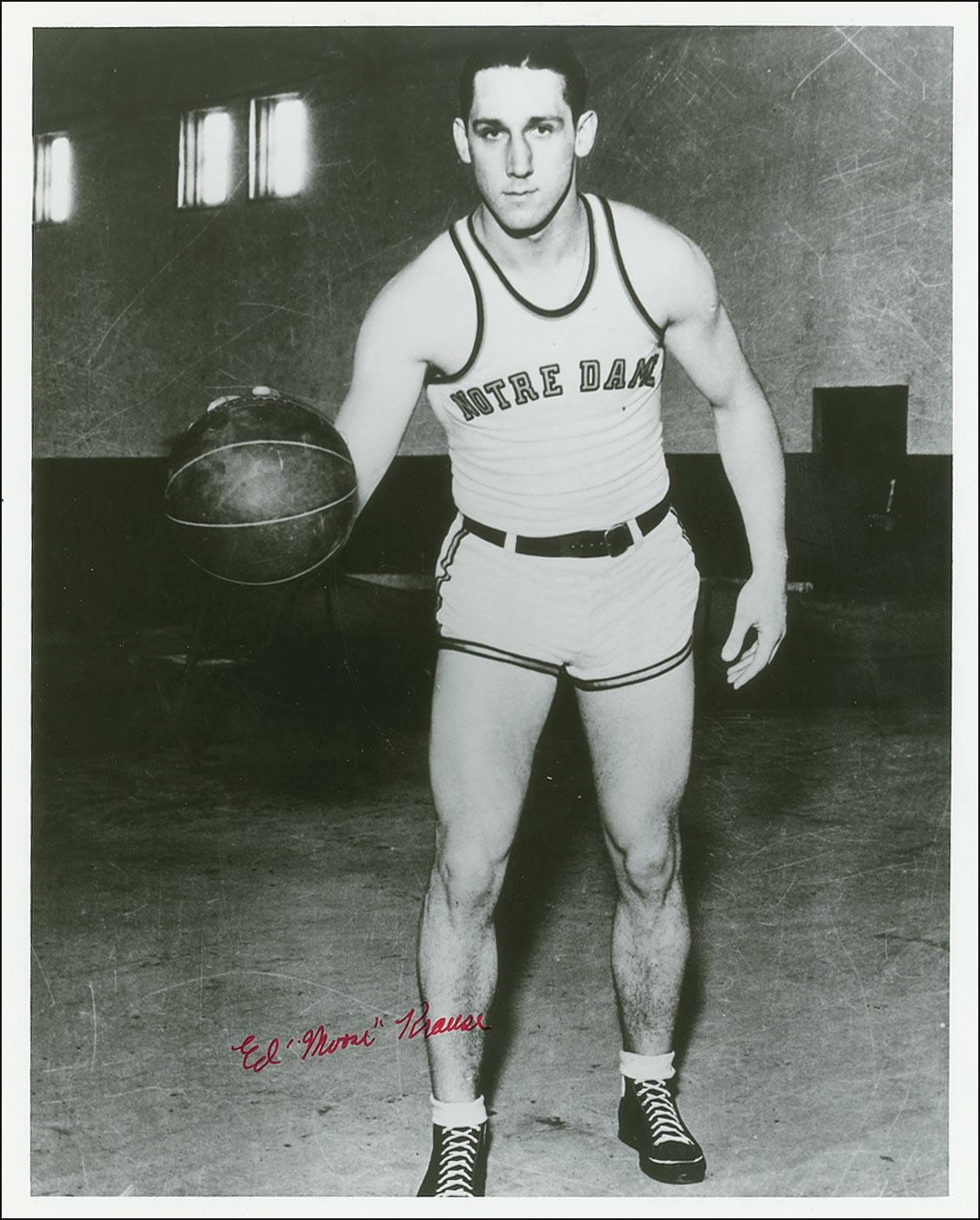 Basketball Hall of Famer (1913-1992) whose size enabled him to dominate the post, and triggered the establishment of the three-second rule. Glossy 8 x 10 photo of Krause in his Notre Dame basketball uniform, signed in red felt tip. In fine condition.