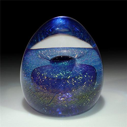 Ed Nesteruk 1998 dichroic egg-shaped paperweight. A translucent purple veil is enveloped by a crackled, blue dichroic veil, under a tall crystal dome. A teardrop-shaped bubble rests at the center of the piece, between the two veils. Signed/dated. Height 3 1/2". <p>Each winning bidder will receive one copy of "All About Paperweigths" and a paperweight stand for each paperweight won. (One book per winner, one stand per paperweight).