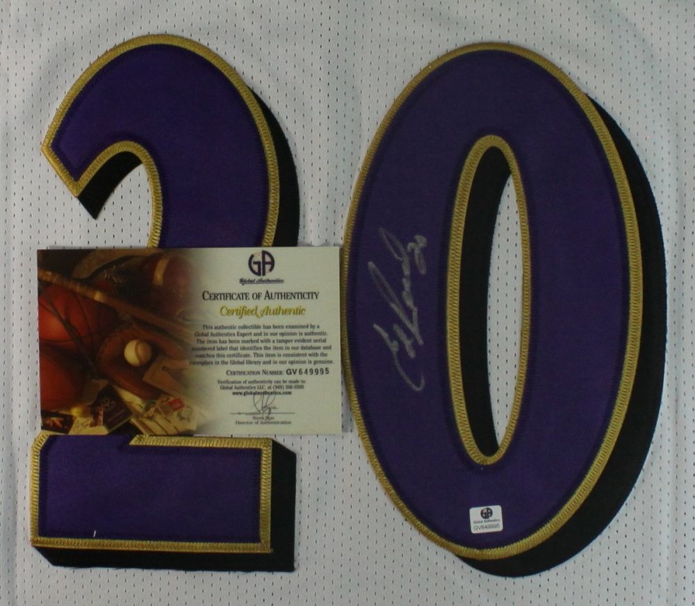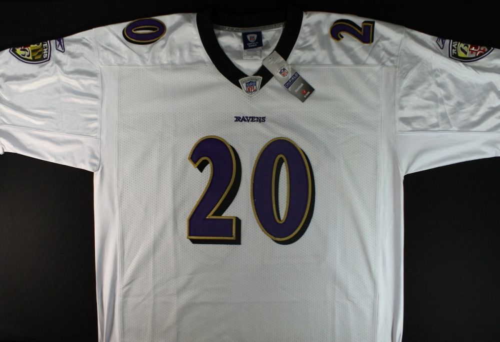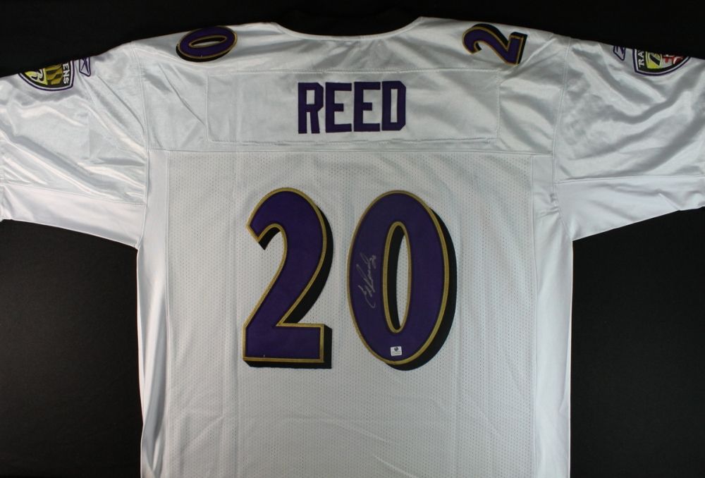 Reebok on-field style jersey. Everything is sewn on, size 52. Hand-signed in silver paint-pen by Ed Reed. Autograph includes a Global Authentics (GA) hologram and matching COA for authenticity purposes.