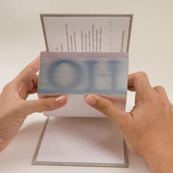 Text "OH" and text "NO" are oriented in opposite directions and only visible when pages are fanned in opposited directions..