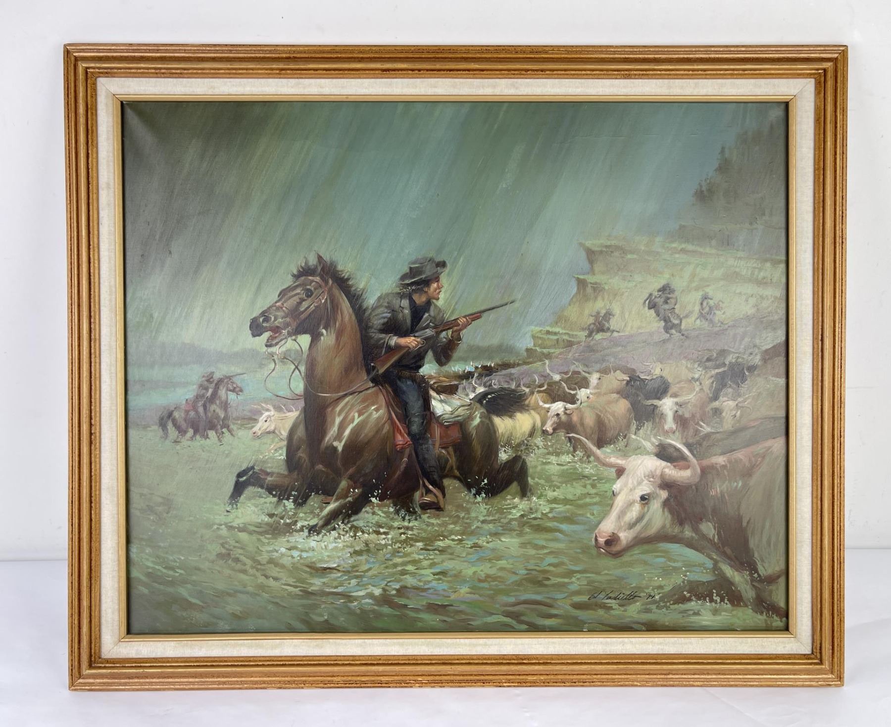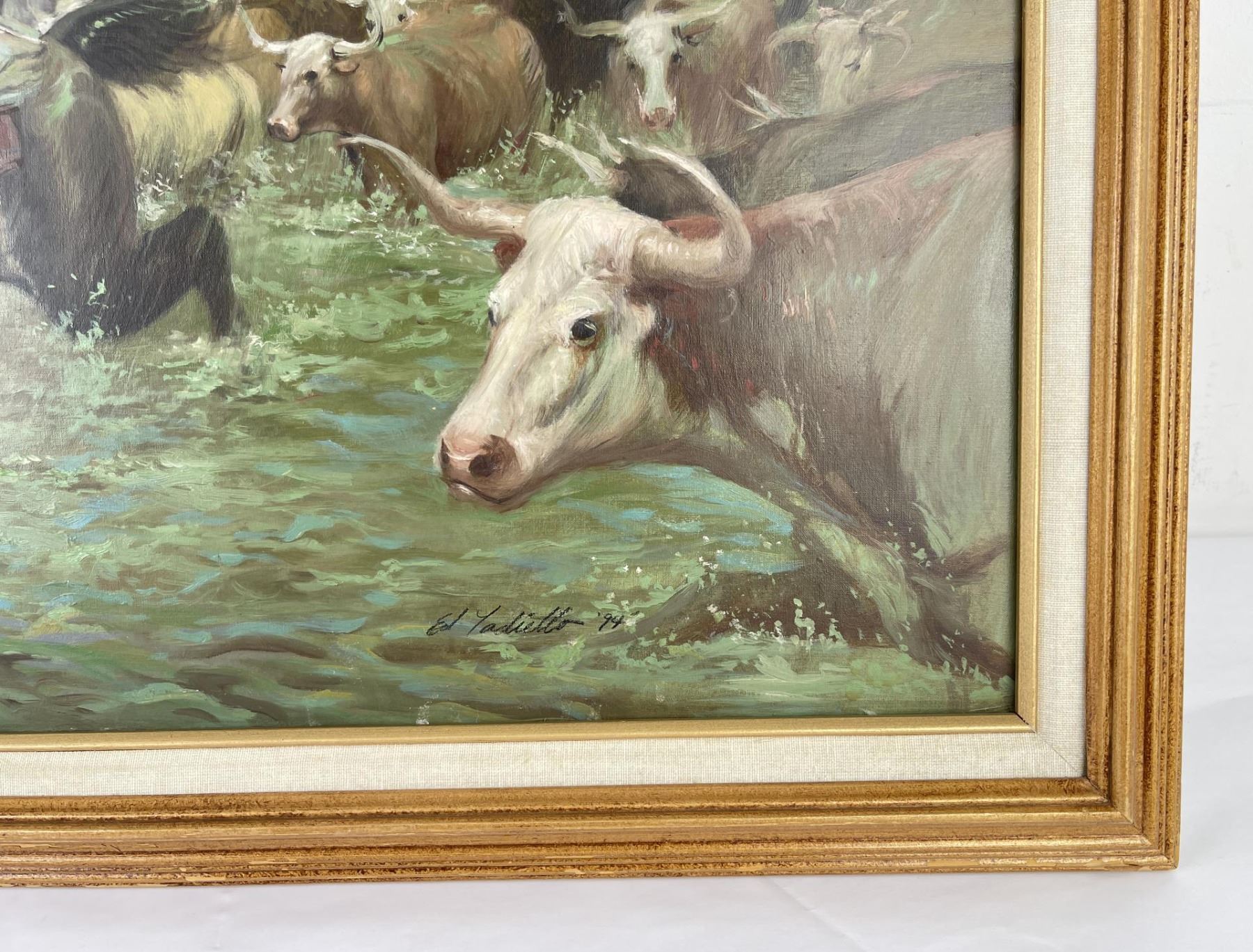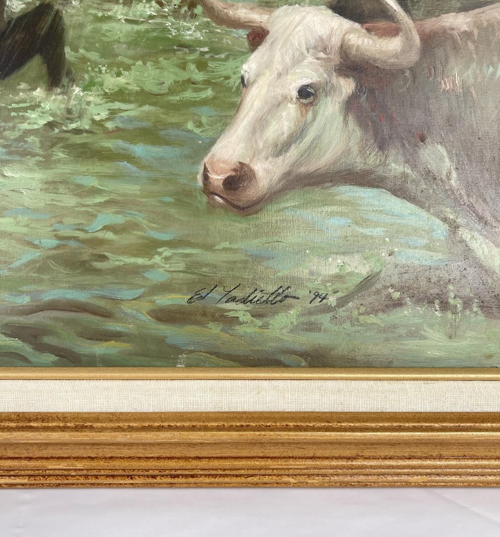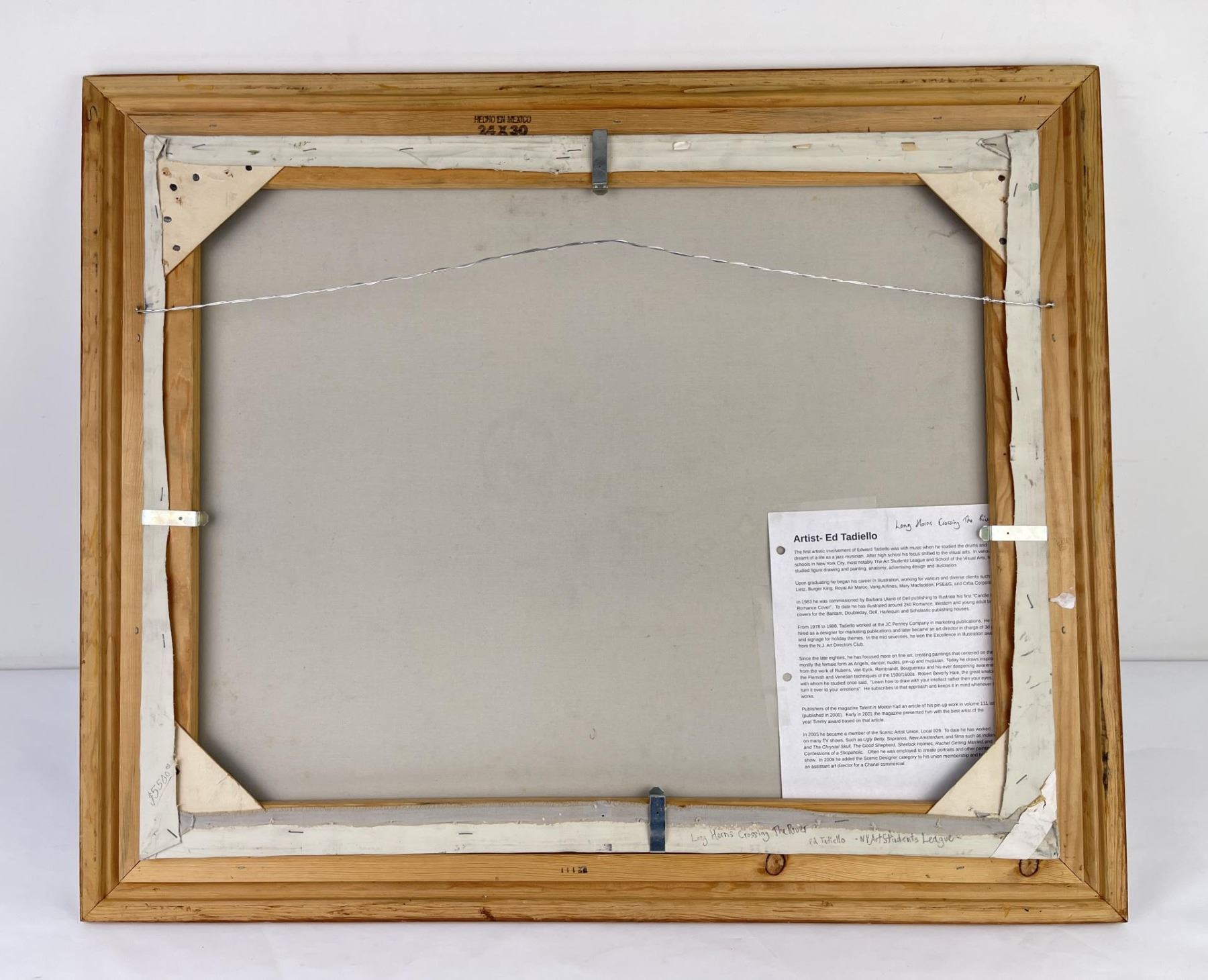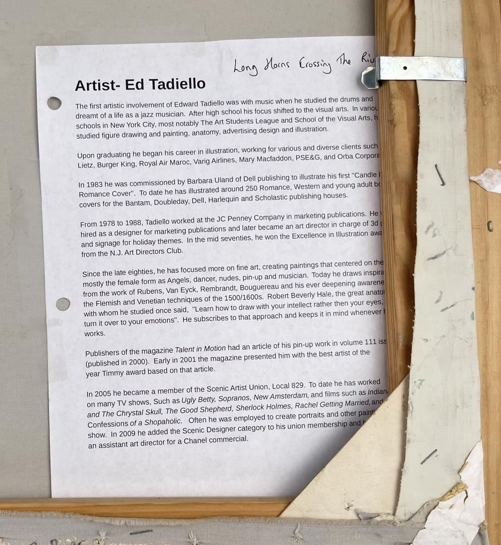 29" by 34.5" framed. The first artistic involvement of Edward Tadiello was with music when he studied the drums and dreamt of a life as a jazz musician. After high school his focus shifted to the visual arts. In various art schools in New York City, most notably The Art Students League and School of the Visual Arts, he studied figure drawing and painting, anatomy, advertising design and illustration. Upon graduating he began his career in illustration, working for various and diverse clients such as Lietz, Burger King, Royal Air Maroc, Varig Airlines, Mary Macfaddon, PSE&G, and Orba Corporation. In 1983 he was commissioned by Barbara Uland of Dell publishing to illustrate his first "Candle Light Romance Cover". To date he has illustrated around 250 Romance, Western and young adult book covers for the Bantam, Doubleday, Dell, Harlequin and Scholastic publishing houses. From 1978 to 1988, Tadiello worked at the JC Penney Company in marketing publications. He was hired as a designer for marketing publications and later became an art director in charge of 3d props and signage for holiday themes. In the mid seventies, he won the Excellence in Illustration award from the N.J. Art Directors Club. Since the late eighties, he has focused more on fine art, creating paintings that centered on the figure, mostly the female form as Angels, dancer, nudes, pin-up and musician. Today he draws inspiration from the work of Rubens, Van Eyck, Rembrandt, Bouguereau and his ever deepening awareness of the Flemish and Venetian techniques of the 1500/1600s. Robert Beverly Hale, the great anatomist with whom he studied once said, "Learn how to draw with your intellect rather then your eyes, then turn it over to your emotions". He subscribes to that approach and keeps it in mind whenever he works.