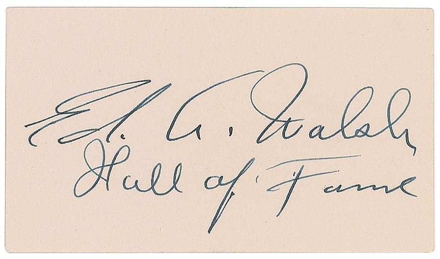 Vintage fountain pen signature, "Ed A. Walsh, Hall of Fame,” on an off-white 3.5 x 2 card. In very fine condition.