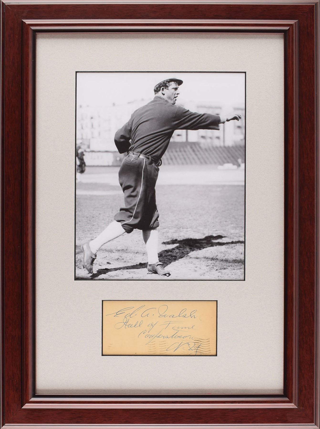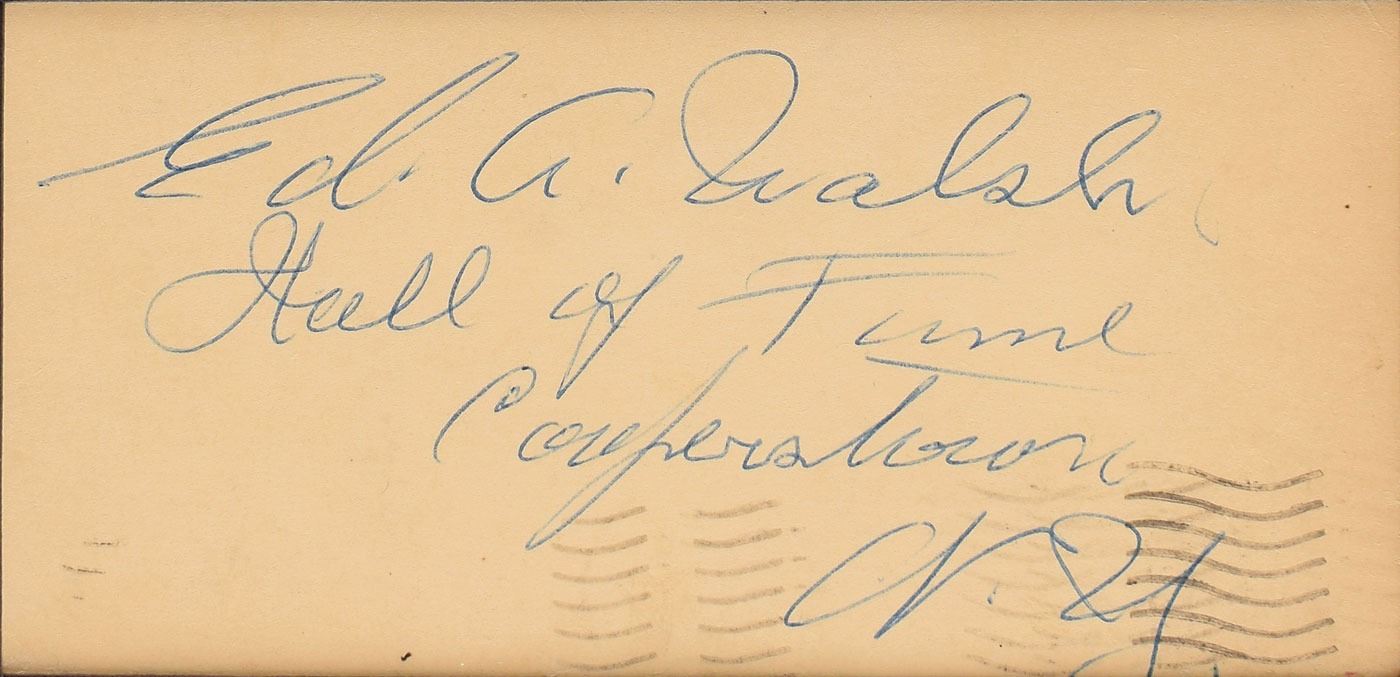 Vintage ballpoint signature, "Ed A. Walsh, Hall of Fame, Cooperstown, N.Y.,” on an off-white 5.25 x 2.5 sheet. Matted and framed with a full-length photo of Walsh to an overall size of 14.75 x 20.25. In fine condition, with postal cancellation to the bottom.