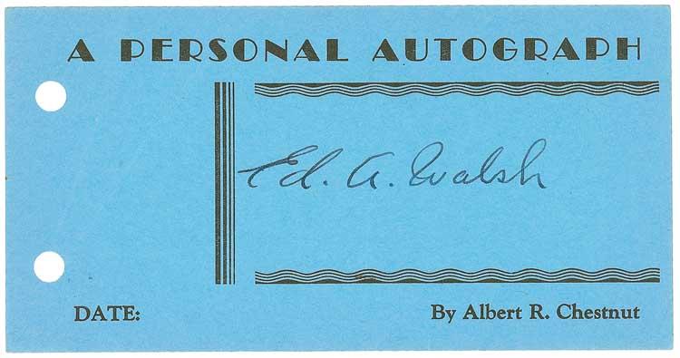 Baseball Hall of Famer best known for his spitballs and for the forty-one-and-a-third innings he pitched in an eight-day span in 1908 in a futile attempt to capture a pennant for the White Sox. Vintage fountain pen signature, “Ed. A. Walsh,” on a 5.5 x 2.75 blue card from the Albert R. Chestnut collection. Two creases to left blank area, otherwise fine condition. From his Pennsylvania home, Chestnut, a printer by profession, began collecting autographs in 1935. He sent these personally-printed cards to over a thousand celebrities and received favorable replies from the vast majority, finally retiring from collecting to raise his family when postage increased from 2¢ per card! Pre-certified Steve Grad/PSA/DNA and RRAuction COA.