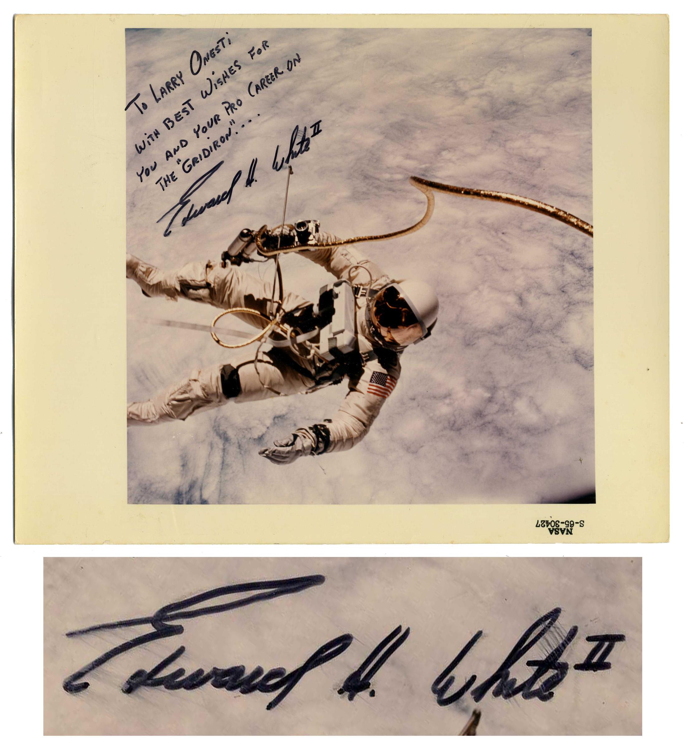 NASA astronaut Ed White signed photo, depicting the former Air Force officer tethered to the Gemini IV spacecraft. On 3 June 1965, he became the first American to ''walk'' in space. Signed items by White are quite rare as he died in 1967 along with fellow astronauts Gus Grissom and Roger Chaffee during a pre-launch test for the first manned Apollo mission at Cape Kennedy. Inscribed in black marker, ''To Larry Onesti / With best wishes for you and your pro career on the 'Gridiron' / Edward H. White II''. Glossy photo measures 10'' x 8'' (image itself measures 7'' x 7.25''), with minor toning. Near fine.