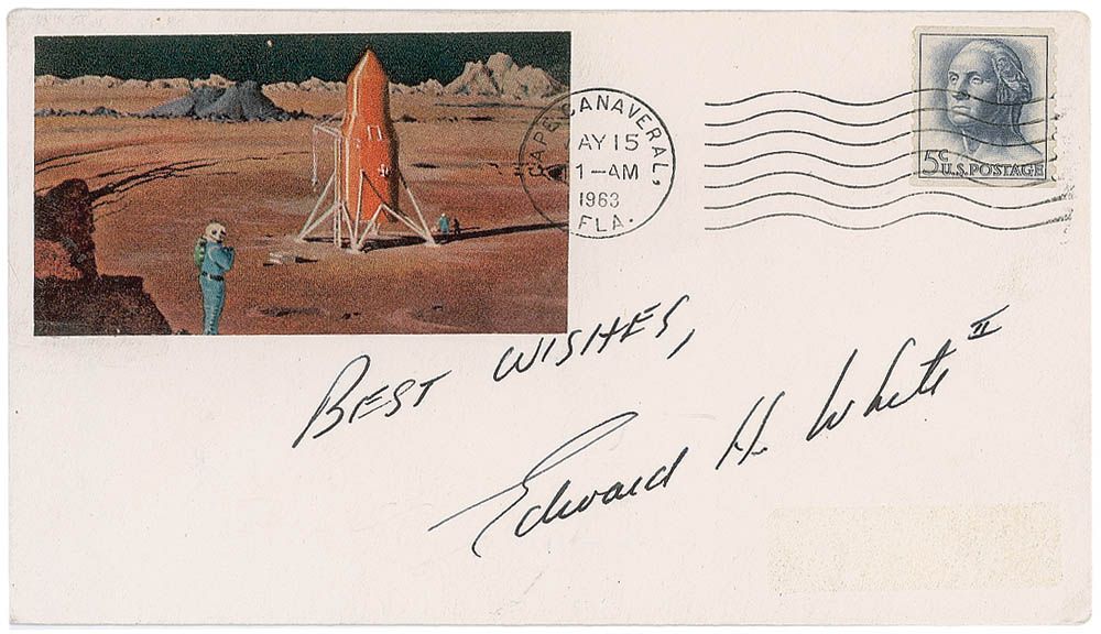 Homemade souvenir commemorative cover with an affixed cachet honoring space travel, bearing a May 15, 1963, Cape Canaveral postmark, signed in black ink, “Best wishes, Edward H. White II.” In fine condition.