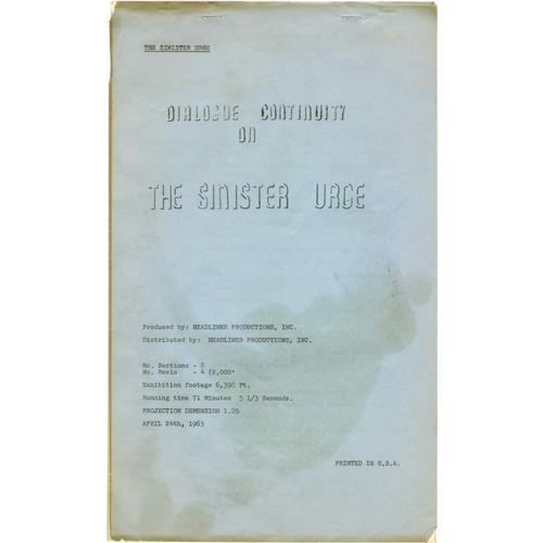 <B>Ed Wood "The Sinister Urge" Script.</B></I> A dialogue continuity script for <I>The Sinister Urge,</B></I> dated April 24, 1963. Written and directed by Ed Wood and released in 1961, it was Wood's follow-up to his infamous Z-grade classic, <I>Plan 9 From Outer Space.</B></I> In Fine to very Fine condition with mild overall wear and tanning, with moderate wear, tanning, and soiling to the cover page.<BR><BR><b>Shipping:</b> Flat Material, Small (<a target="_blank" href="http://www.heritageauctions.com/common/shipping.php">view shipping information</a>)