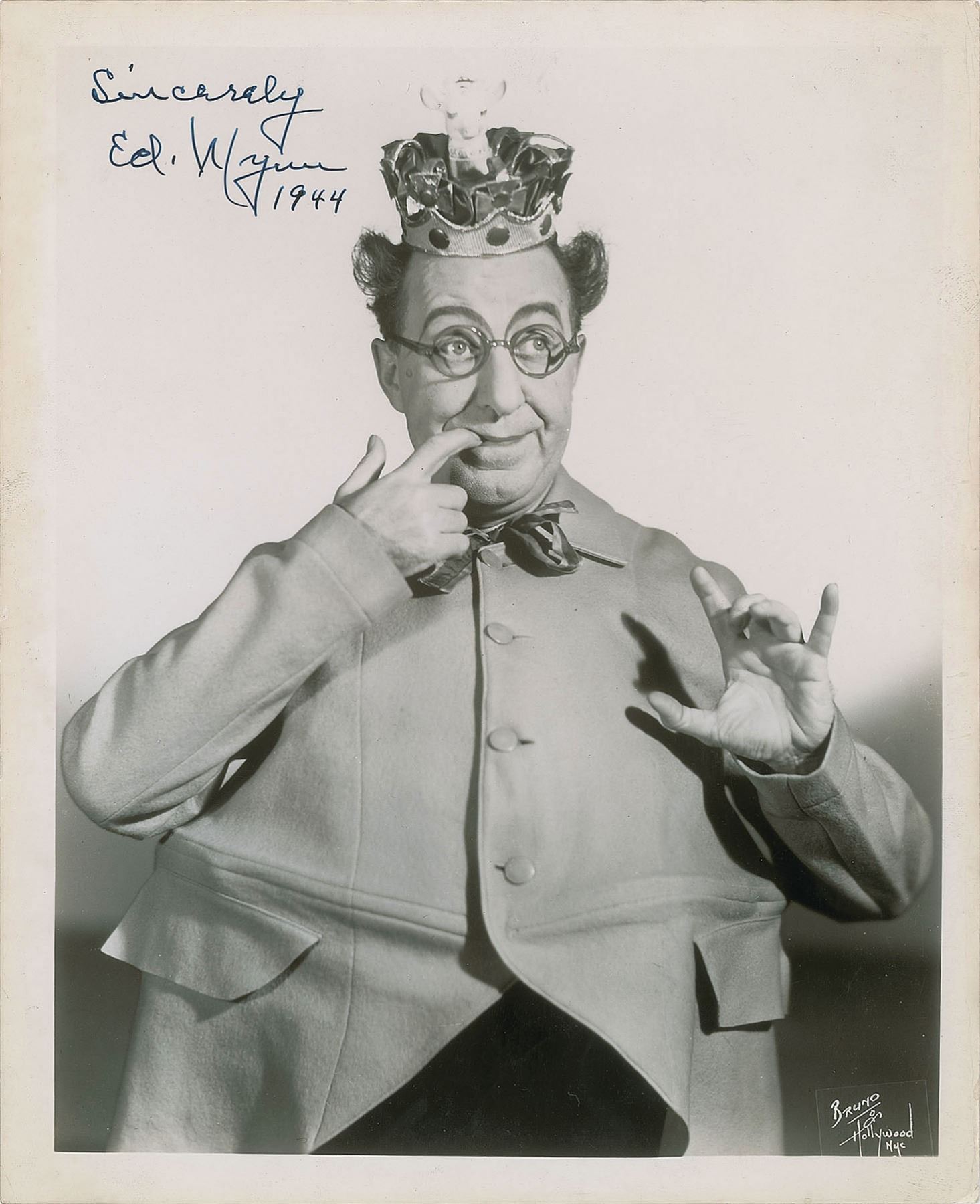 Comical vintage glossy 8.5 x 10 photo of Wynn by Bruno of Hollywood, signed in fountain pen, “Sincerely, Ed. Wynn, 1944.” In fine condition, with trivial creasing and toning to edges.