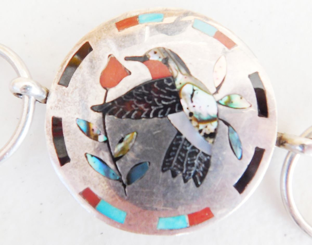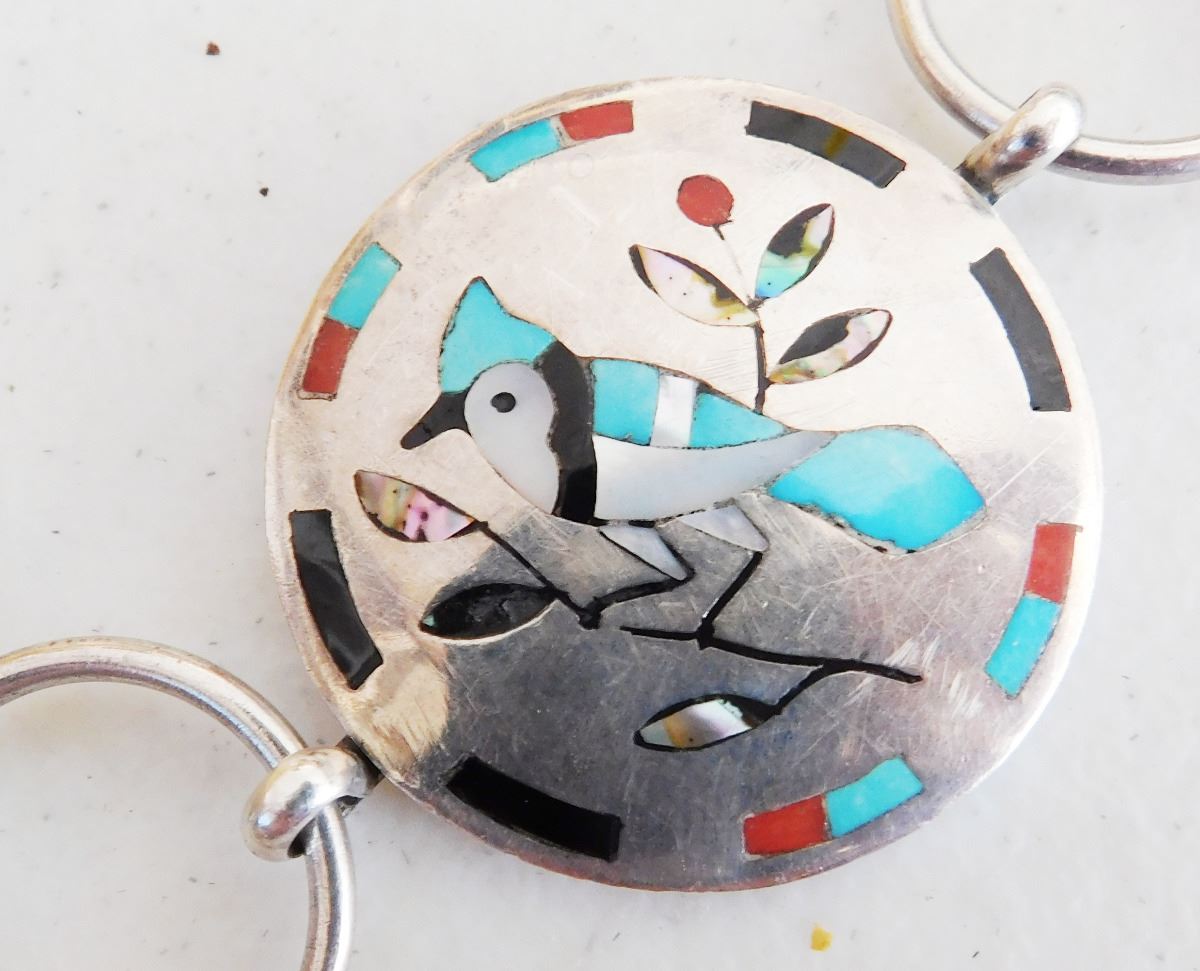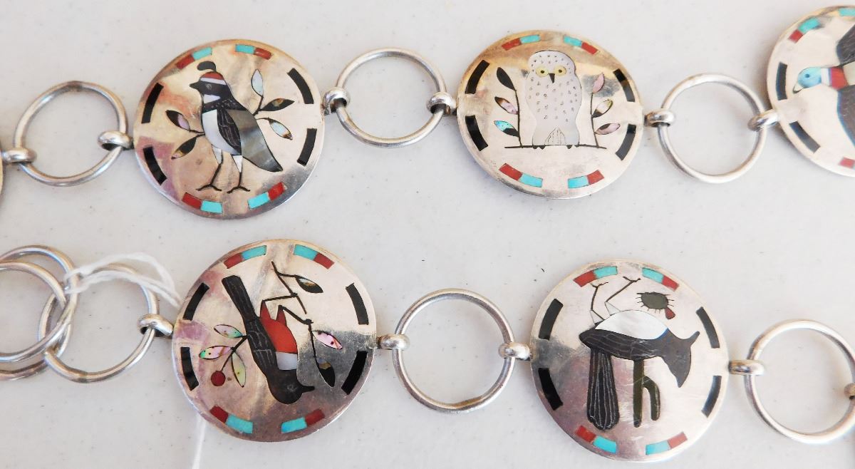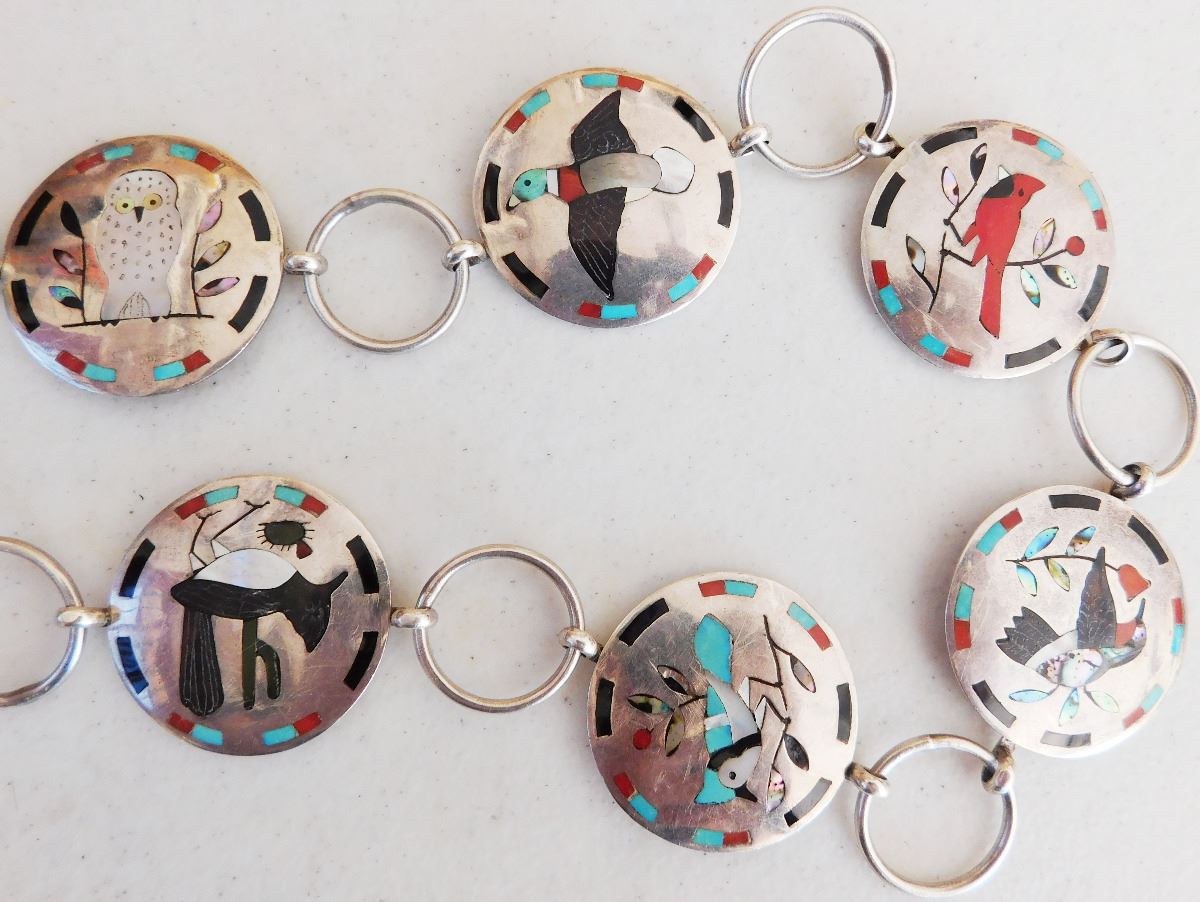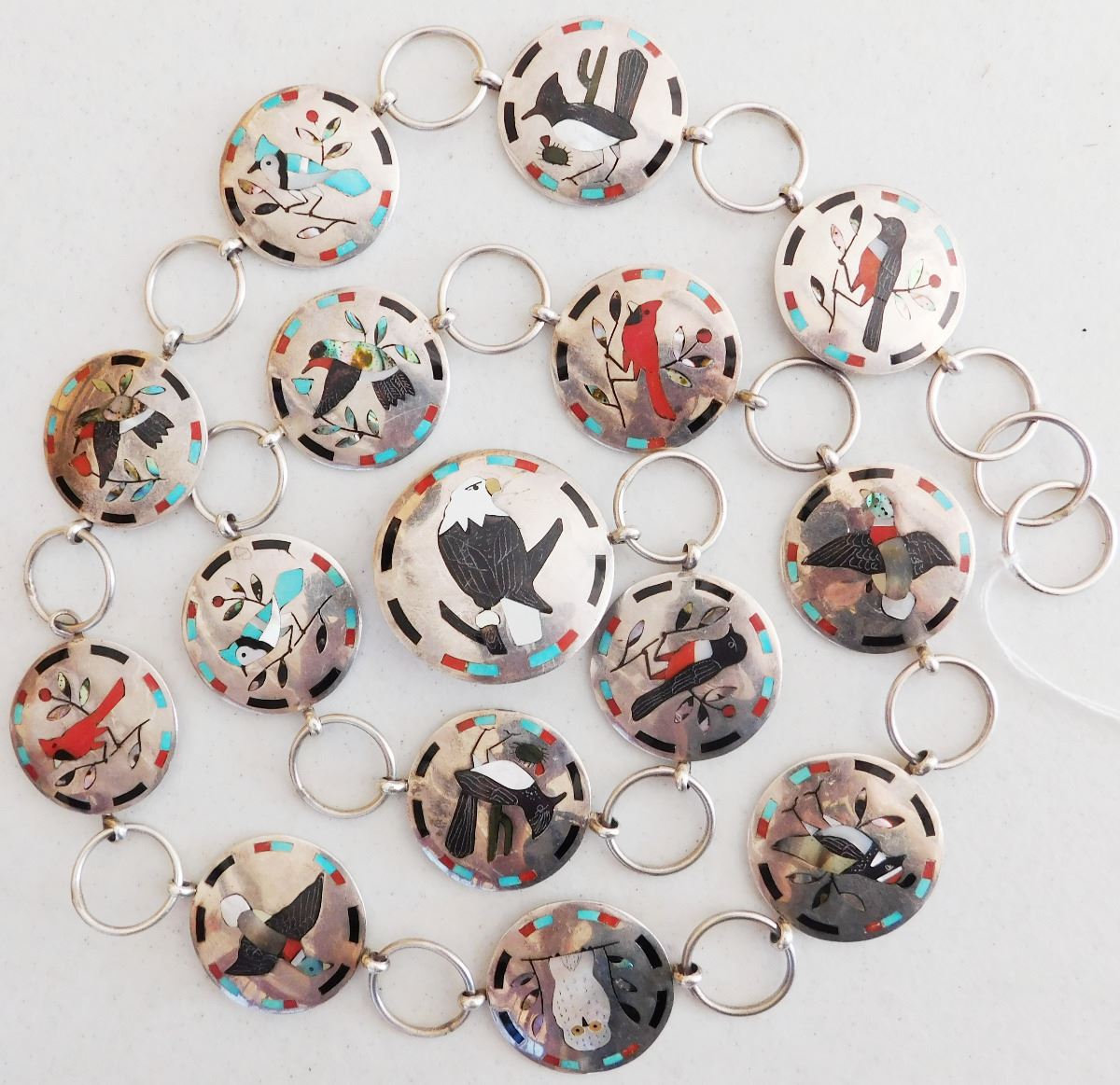 Edaakie Signed Sterling Silver Concho Belt, signed by Derrick and Nichelle Edaakie, circa 1970s. The link belt features silver, coral, turquoise, jet, mother of pearl and abalone shell. The belt is 40.5" long and features birds. The main concho has an eagle and measures 2 x 2 inches. The other fourteen Conchos each measure 1 1/2 inches with the total length approximately 40.5 inches. There are six matching pairs of birds, a white owl and a quail. D.Harvey collection. Silver weight is 159.5 grams. Condition: Worn, showing very slight scuffs. There are no missing pieces on the inlay designs, see images. Shipping: $16.50