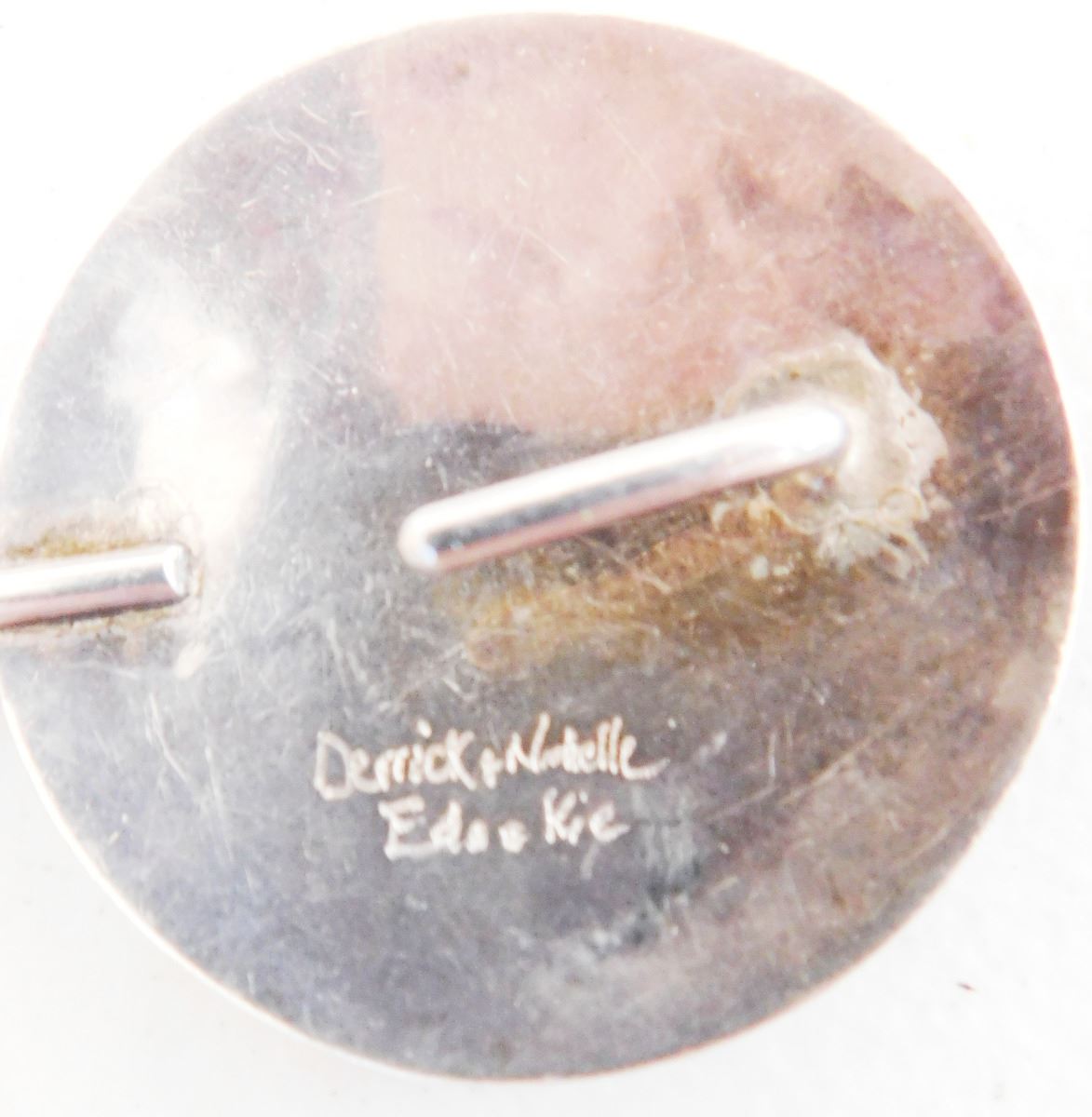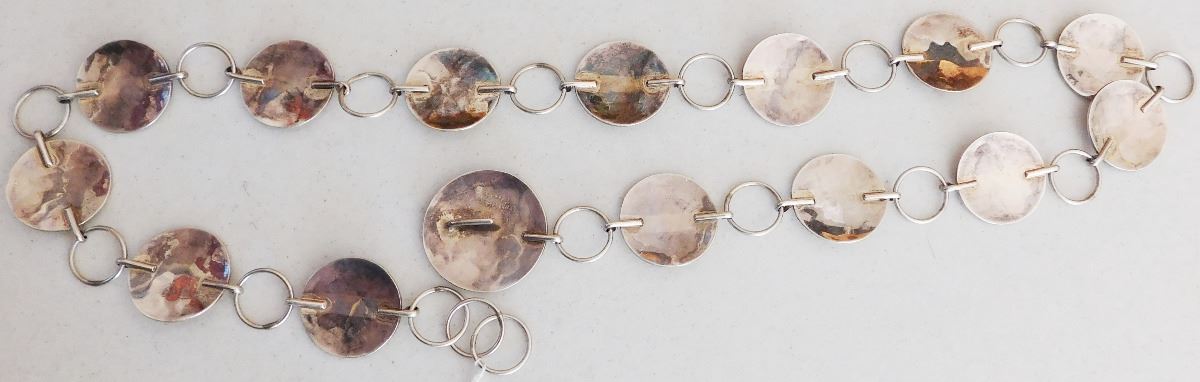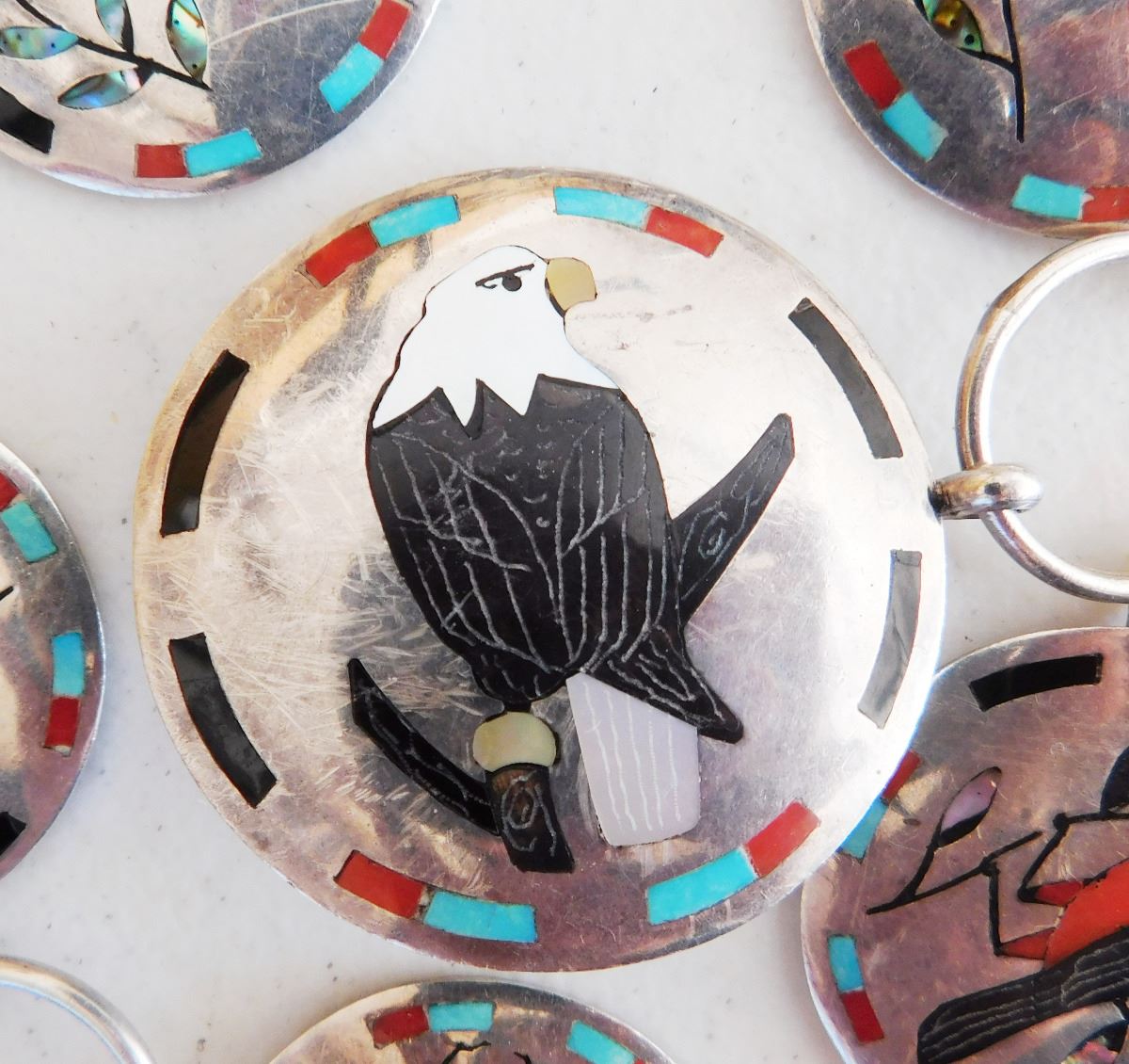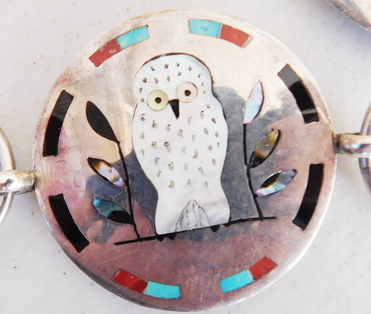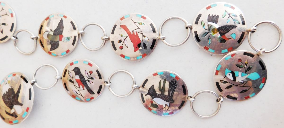 Edaakie Signed Sterling Silver Concho Belt, signed by Derrick and Nichelle Edaakie, circa 1970s. The link belt features silver, coral, turquoise, jet, mother of pearl and abalone shell. The belt is 40.5" long and features birds. The main concho has an eagle and measures 2 x 2 inches. The other fourteen Conchos each measure 1 1/2 inches with the total length approximately 40.5 inches. There are six matching pairs of birds, a white owl and a quail. D.Harvey collection. Silver weight is 159.5 grams. Condition: Worn, showing very slight scuffs. There are no missing pieces on the inlay designs, see images. Shipping: $16.50