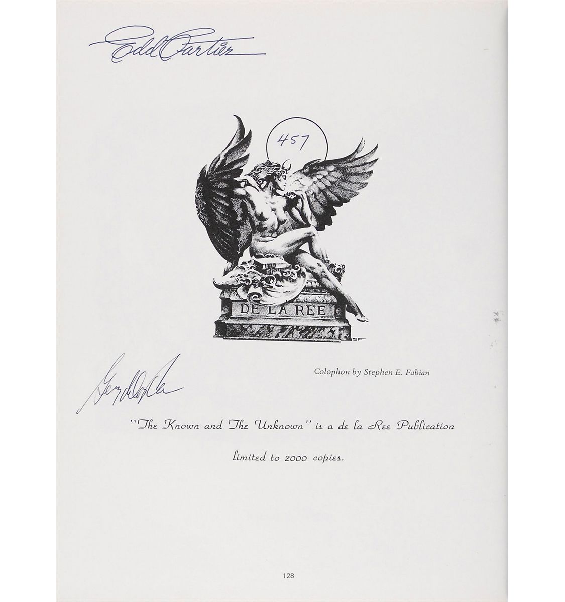 American pulp magazine illustrator who specialized in science fiction and fantasy art (1914–2008). Signed book: The Known and the Unknown. Limited edition, numbered 457/2000. Saddle River, NJ: Gerry de la Ree, 1977. Hardcover with dust jacket, 8.75 x 11.25, 128 pages. Signed on the colophon in black ink by Edd Cartier and Gerry de la Ree. In fine condition.