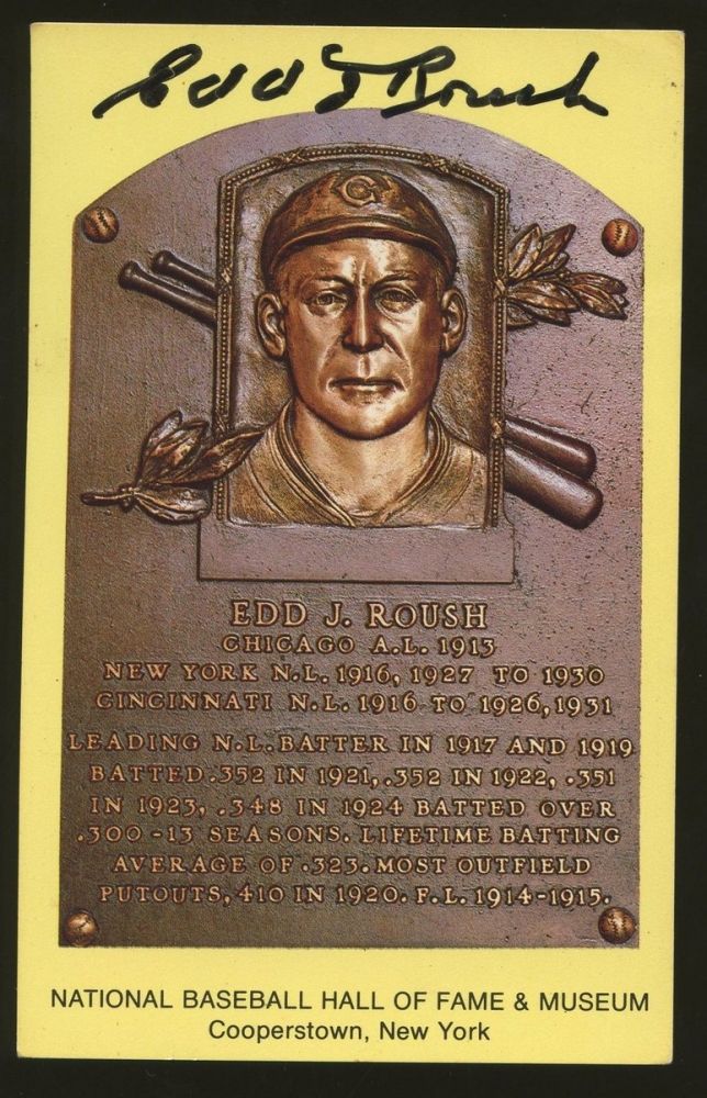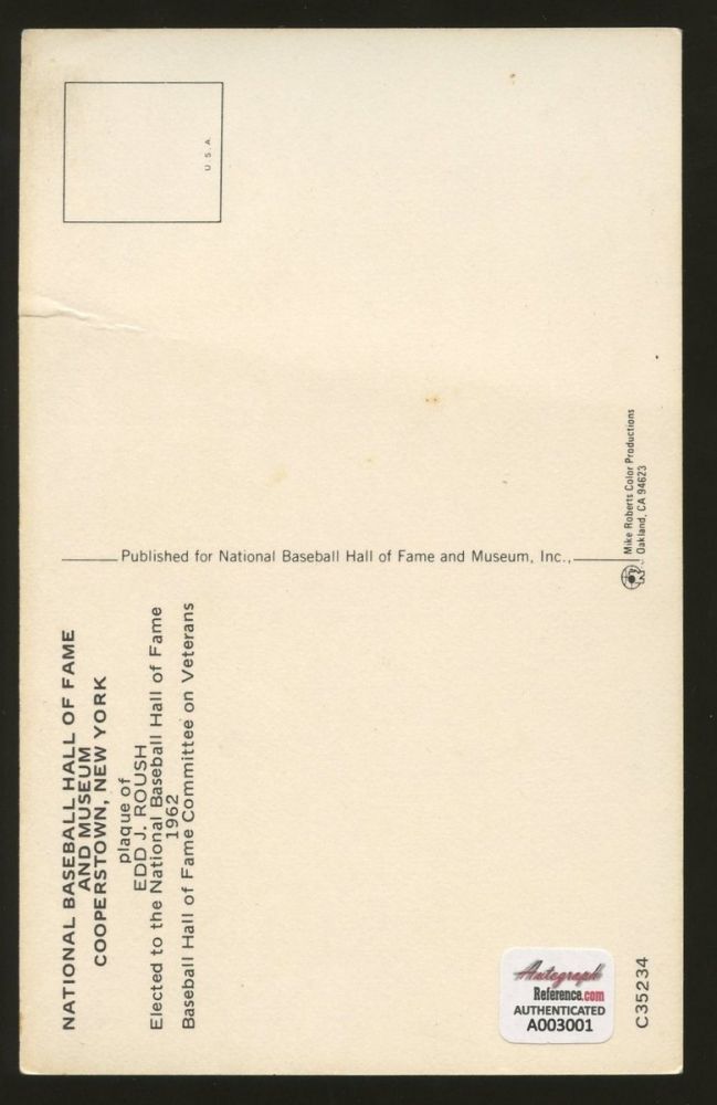 Gold Hall of Fame postcard hand-signed in black felt tip pen by Edd Roush (D 1988). Autograph includes an Autograph Reference COA for authenticity purposes.