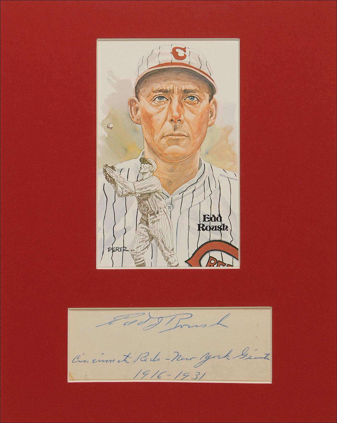 Ballpoint signature and notation, “Edd J. Roush, Cincinnati Reds—New York Giants, 1916–1931,” on an off-white 4.75 x 1.75 slip. Matted with a Perez-Steele card to an overall size of 8 x 10. Central vertical fold, an area of adhesive staining at the lower left corner, and light toning, otherwise fine condition.