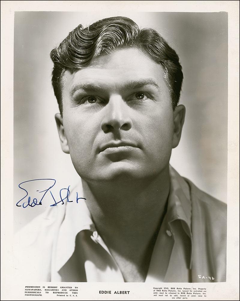 Vintage glossy 8 x 10 RKO publicity photo, signed in fountain pen “Eddie Albert.” In fine condition, with light edge wear and a tiny bottom right corner chip.