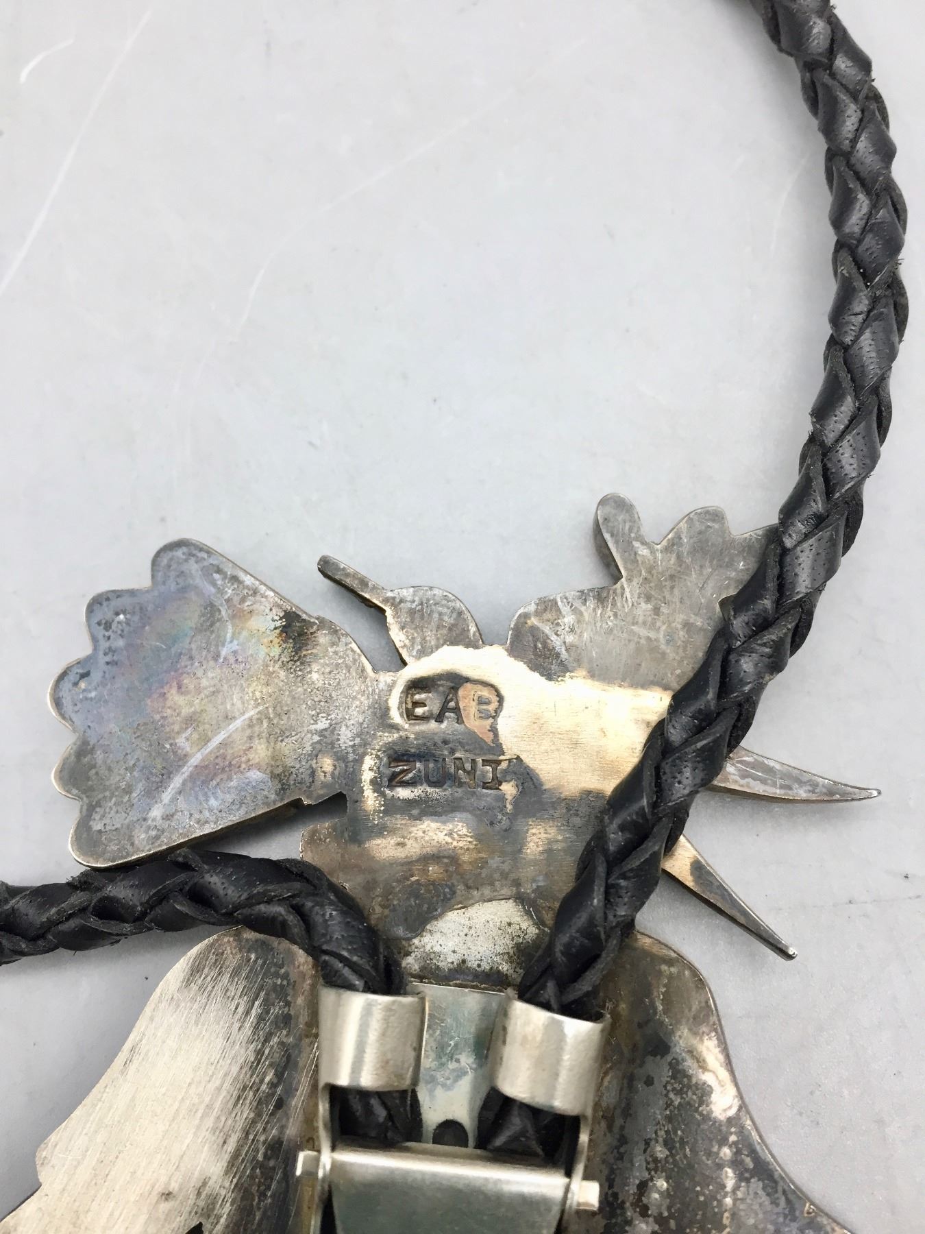 Description: Presented for sale in this lot is a very nice, highly collectible, bolo by the master Zuni artist, Eddie Beyuka. It’s on a black leather cord with custom sterling silver tips shaped as drums. The slide features a large inlay design featuring coral, shell, turquoise, mother of pearl, black onyx and the rare tortoise shell. It also comes with a stand. Tested as sterling silver. Maker: Hallmarked EAB, Zuni. Edward Beyuka, Zuni, (1921 - 2002). Approx. Age: Vintage. Size: Fits a 39” neck. Slide measures 3”w x 5-1/2”t.Weighs 128 grams. Condition: Good for its age, normal wear expected. Please look closely at the pictures - they are an important part of our description. Shipping: There will be a $5 handling / packaging fee for shipping this lot. The actual cost of postage will be added on top of that.
