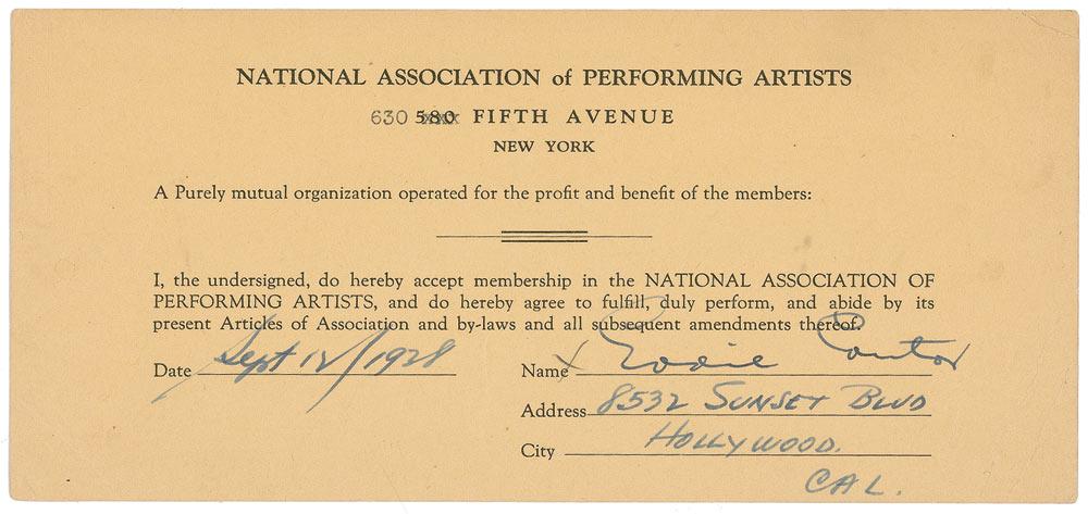 DS, signed “Eddie Cantor,” one page, 8.25 x 3.75, September 12, 1938. National Association of Performing Artists agreement. In part: “I, the undersigned, do hereby accept membership in the National Association of Performing Artists, and do hereby agree to fulfill, duly perform, and abide by its present Articles of Association and by-laws and all subsequent amendments thereof.” In fine condition, with mild creasing primarily at the corners.