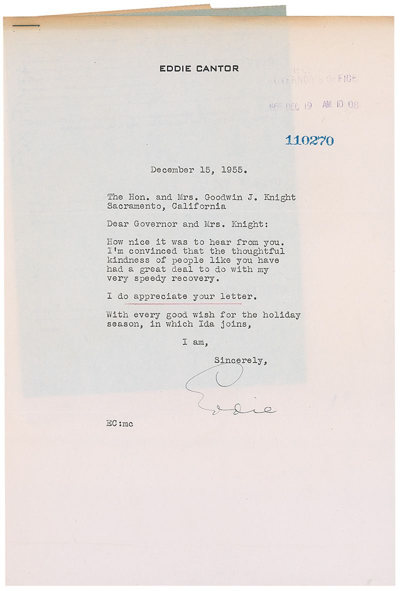 TLS signed “Eddie,” one page, 7.25 x 10.5, personal letterhead, December 15, 1955. Letter to California Governor Goodwin Knight. In part: “How nice it was to hear from you. I’m convinced that the thoughtful kindness of people like you have a great deal to do with my speedy recovery.” Office stamp to top right, horizontal fold through lower portion of signature, staple to top left, and some toning along top edge, otherwise fine condition. The original mailing envelope is stapled to the letter.