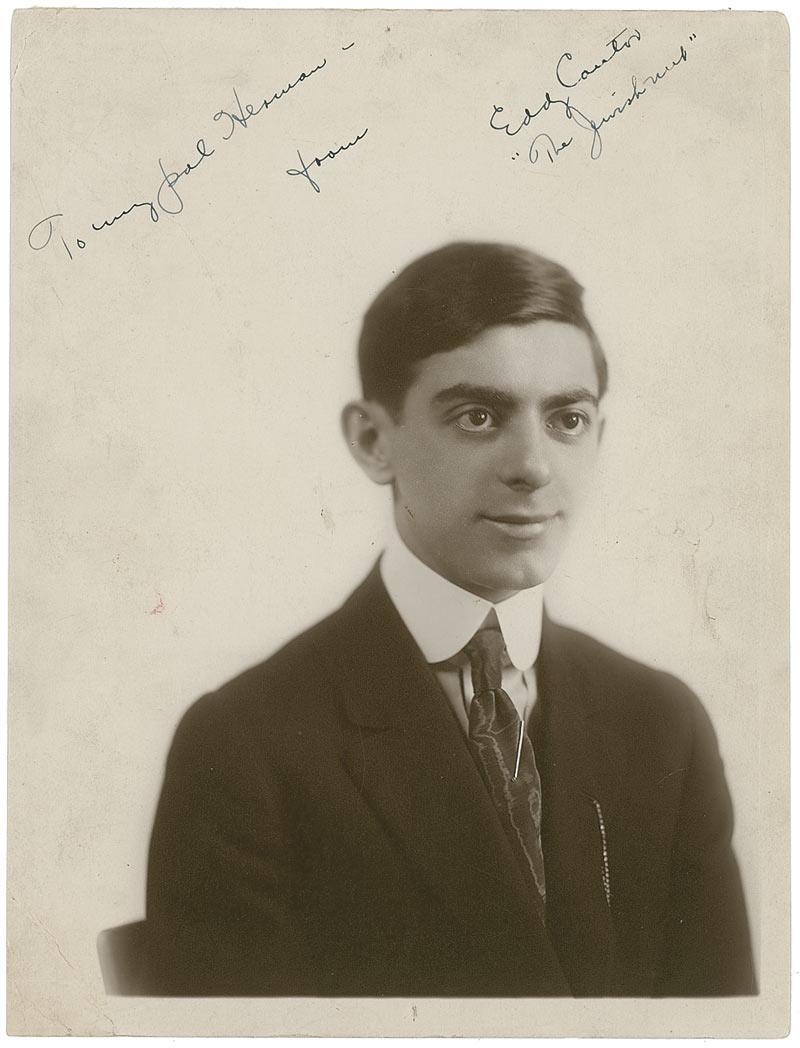 Vintage matte-finish 7.5 x 10 photo, signed and inscribed in fountain pen “To my pal Herman—from Eddy Cantor ‘The Jewish Nut.’” In very good condition, with scattered creasing and soiling, a small tack hole to bottom border, and a few small spots.