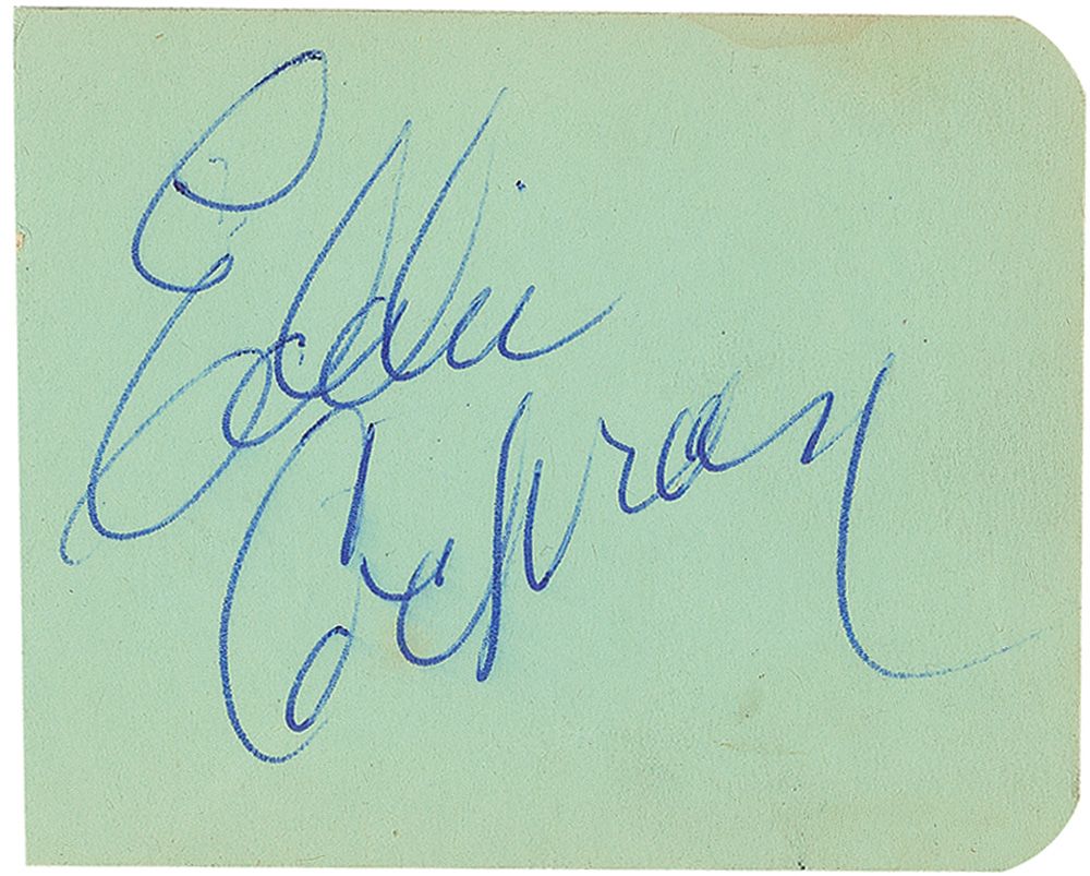 Dynamic, pioneering rock ’n’ roll musician (1938–1960), best known for his hit ‘Summertime Blues,’ who met his untimely end in a fatal automobile crash at the age of 22. Vintage ballpoint signature, “Eddie Cochran,” on a light green 3 x 2.5 album page. In fine condition, with some scattered light toning and soiling.