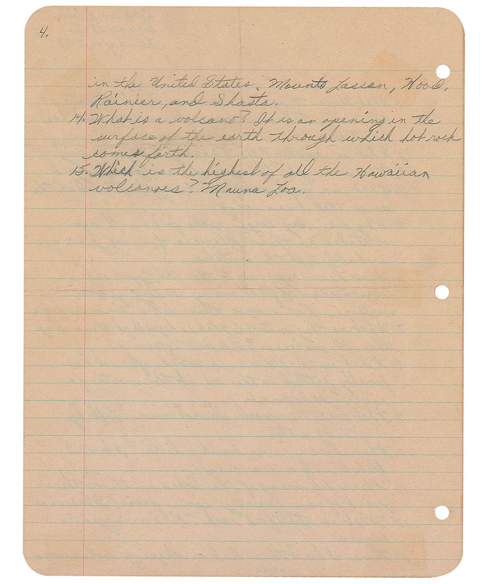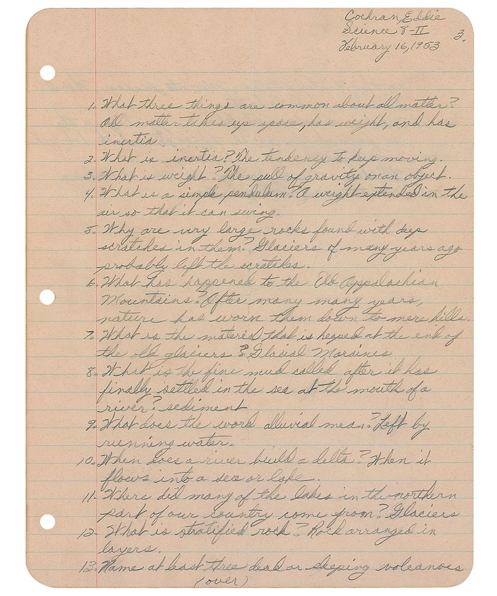 Dynamic, pioneering rock ’n’ roll musician (1938–1960), best known for his hit ‘Summertime Blues,’ who met his untimely end in a fatal automobile crash at the age of 22. Cochran’s handwritten homework, in pencil, one lightly-lined page, both sides, 8.5 x 11, headed at the top by Cochran, “Cochran, Eddie, Science 8-II, February 16, 1953.” Cochran writes out 15 questions about rivers, glaciers, and volcanoes, adding the answer after each question. One reads: “Name at least three dead or sleeping volcanoes in the United States. Mounts Lassen, Hood, Rainier, and Shasta.” In fine condition, with central horizontal and vertical folds, and a uniform shade of toning.
