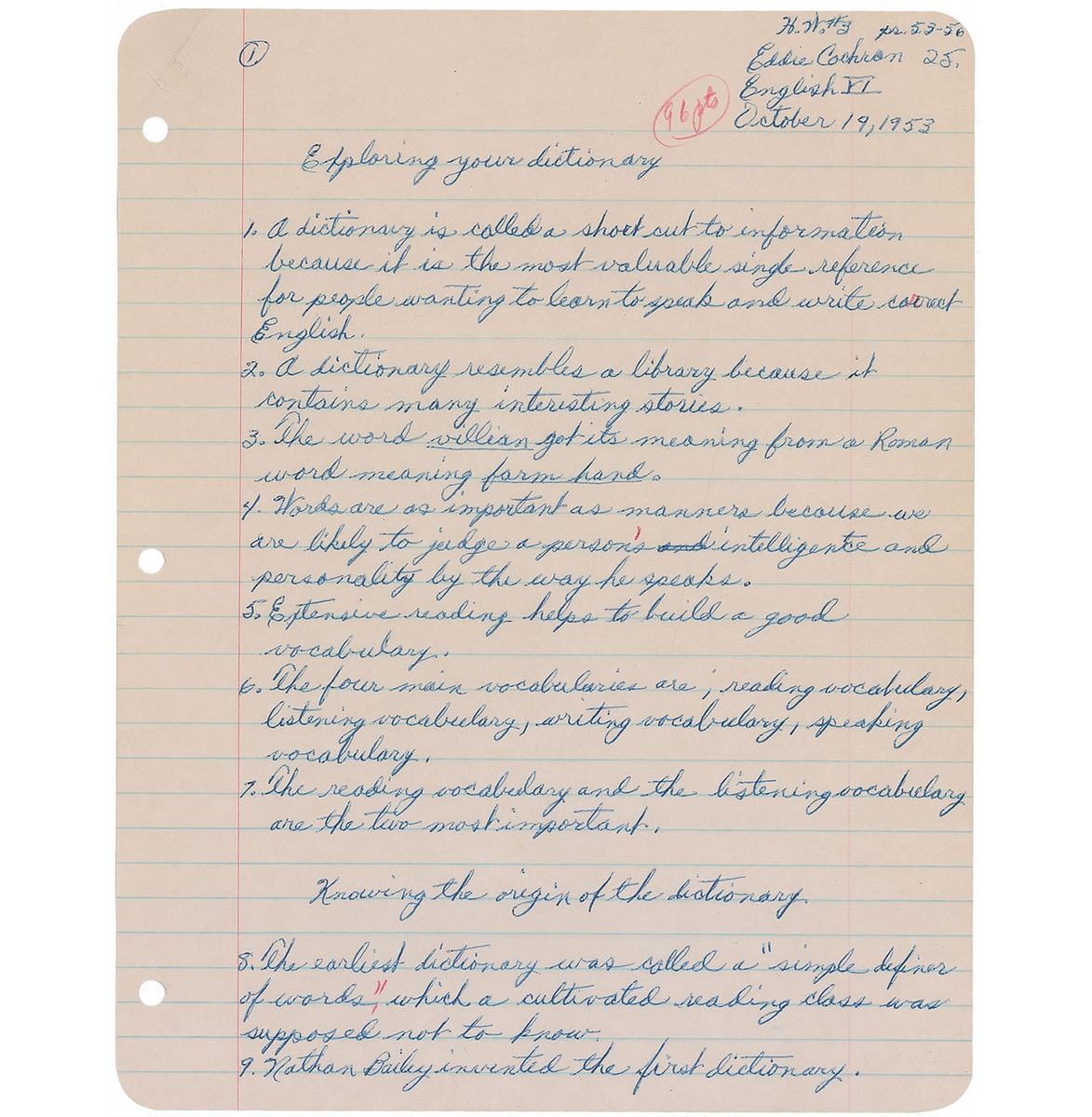 Handwritten homework assignment, one lined page, 8.5 x 11, signed at the top in blue ballpoint, “Eddie Cochran, English VI, October 19, 1953.” Headed “Exploring your dictionary,” Cochran pens lengthy responses to several questions about the use and history of dictionaries. In part: “A dictionary is called a short cut to information because it is the most valuable single reference for people wanting to learn to speak and write correct English…Words are as important as manners because we are likely to judge a person’s intelligence and personality by the way he speaks.” The assignment is graded at the top in red pencil with a very good score of 96 points. In fine condition.