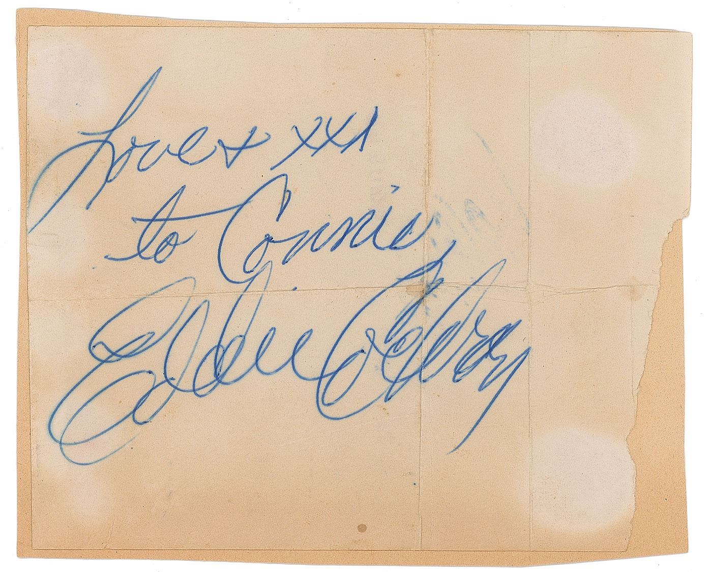 American rock 'n' roll musician (1938–1960) best known for his hit 'Summertime Blues,' who met his untimely end in a fatal automobile crash at the age of 21. Vintage ballpoint signature and inscription, "Love & xxx to Connie, Eddie Cochran,” on an off-white 5.5 x 4.25 sheet affixed to a slightly larger mount. In very good condition, with light toning, intersecting folds, and circular discoloration from mounting at the corners and left edge.