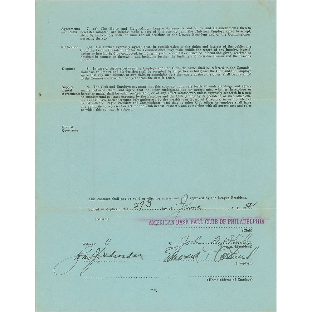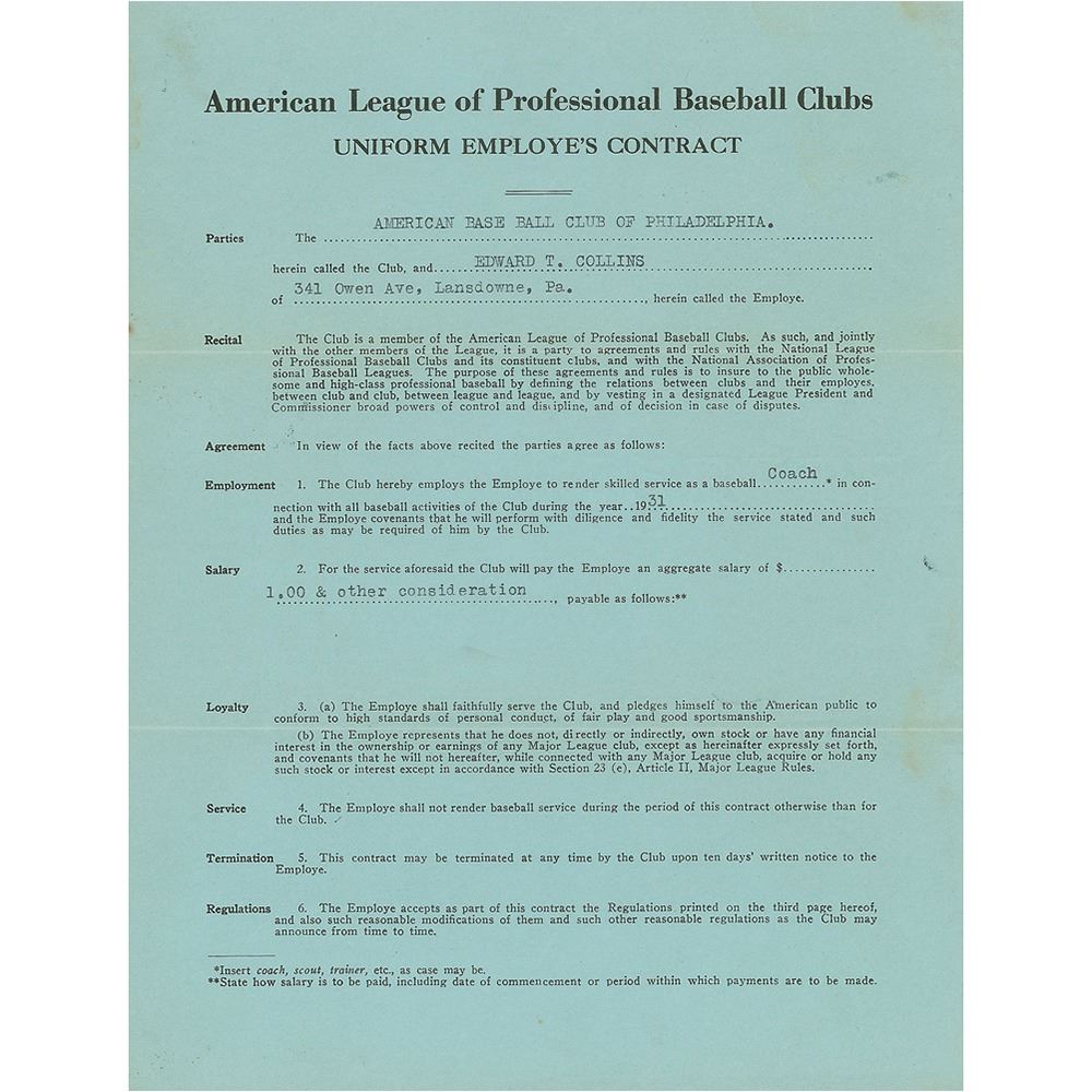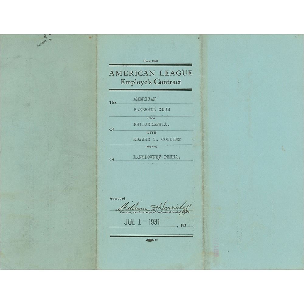 Contract, signed “Edward T. Collins,” four pages on two adjoining sheets, 8.5 x 11, June 27, 1931. American League uniform employee’s contract in which Eddie Collins agrees to render "skilled services as a baseball coach...during the year 1931" for the Philadelphia Athletics, for “1.00 & other consideration.” Signed at the conclusion in fountain pen by Collins and countersigned by A’s Owner John Shibe and Connie Mack's secretary and business manager Bob Schroeder. The reverse is signed by American League President William Harridge. In fine condition, with toning to back page. Following his last season as a player in 1930 for the A's, Collins's natural transition to coach yielded the Athletics another trip to the World Series in 1931.