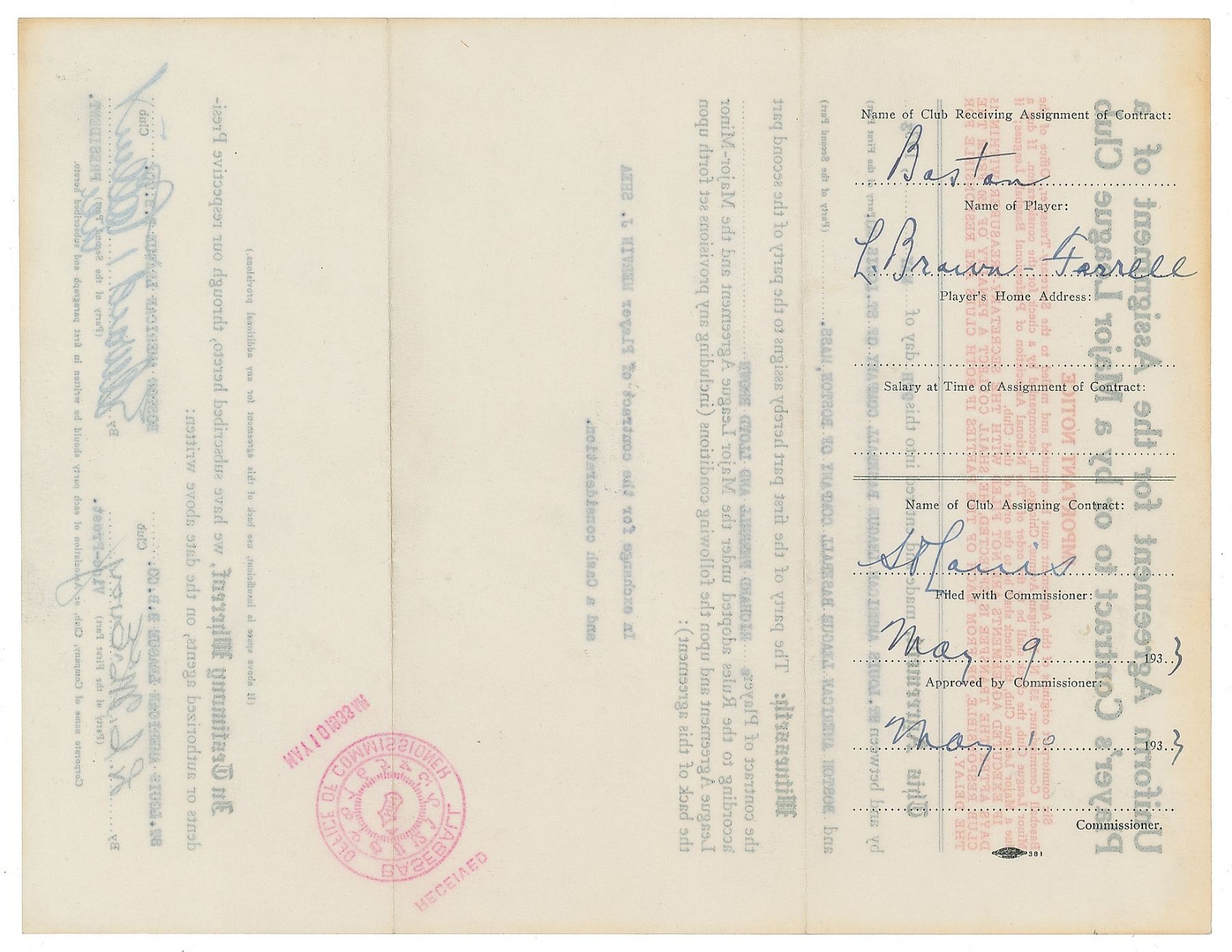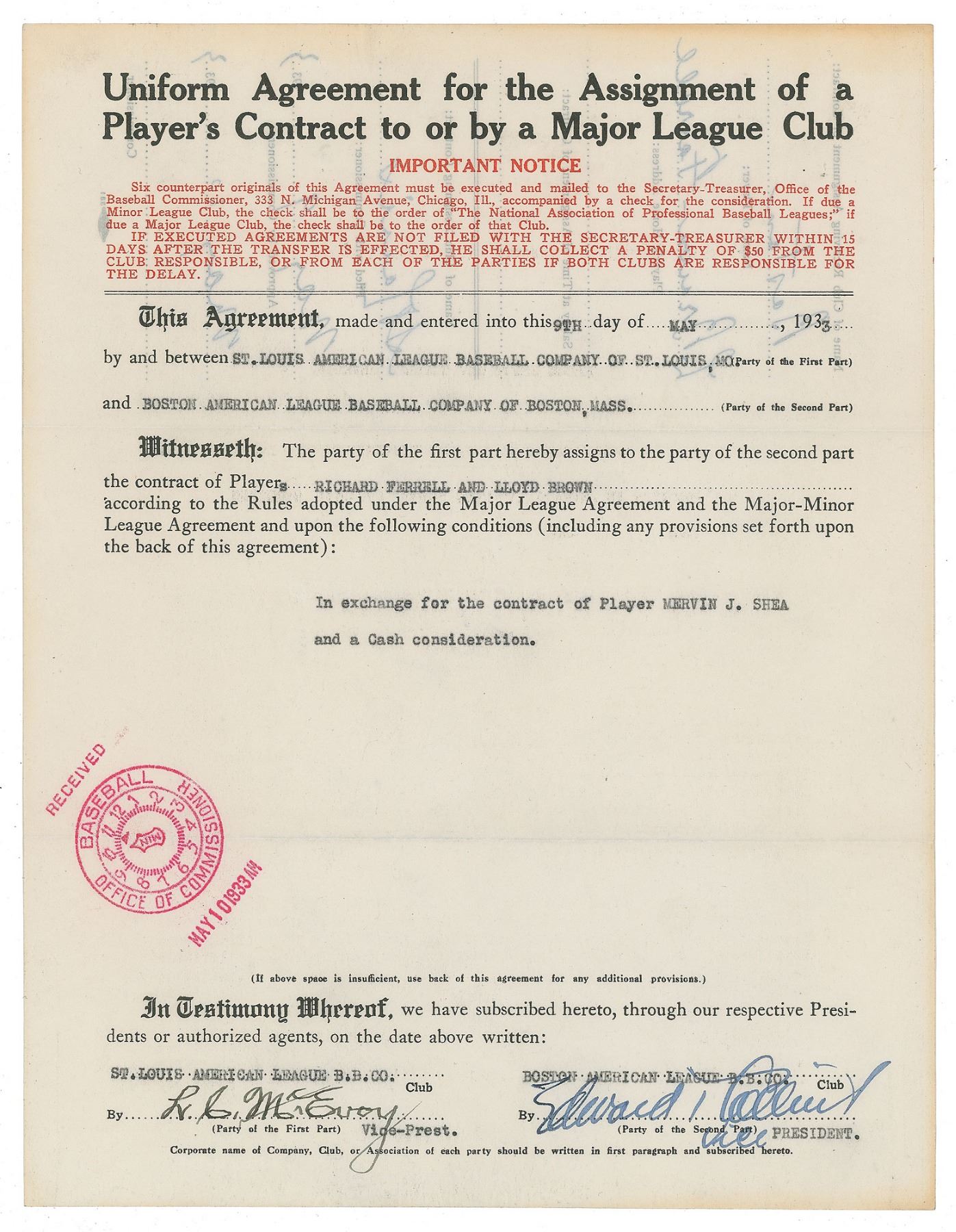 Contract, signed "Edward T. Collins, Jr., Vice," one page, 8.5 x 11, May 9, 1933. Agreement in which the Boston American League Baseball Company assigns the contracts of future HOFer Richard Ferrell and Lloyd Brown to the St. Louis American League Baseball Company in "exchange for the contract of Player Mervin J. Shea and a Cash consideration." Signed at the conclusion in fountain pen by Collins and countersigned by the vice president of the St. Louis American League, L. C. McEvoy. Ferrell was an eight-time all-star who played catcher for the St. Louis Browns, Boston Red Sox, and Washington Senators over the course of 18 seasons, and was regarded as one of the best catchers in baseball during the 1930s and early 1940s. He was elected to the Baseball Hall of Fame in 1984. This contract relates to Ferrell's request to be upgraded to the major leagues after a hearing with the baseball commissioner Kenesaw Mountain Landis revealed that the Tigers and Reds had colluded to keep Ferrell in the minor leagues. After receiving offers from many major league clubs, he signed a contract with the St. Louis Browns for $25,000. In excellent overall condition.