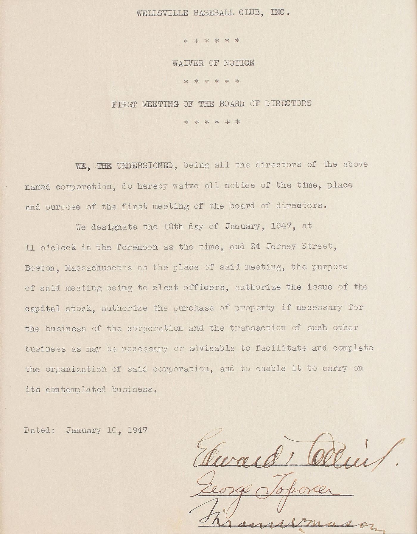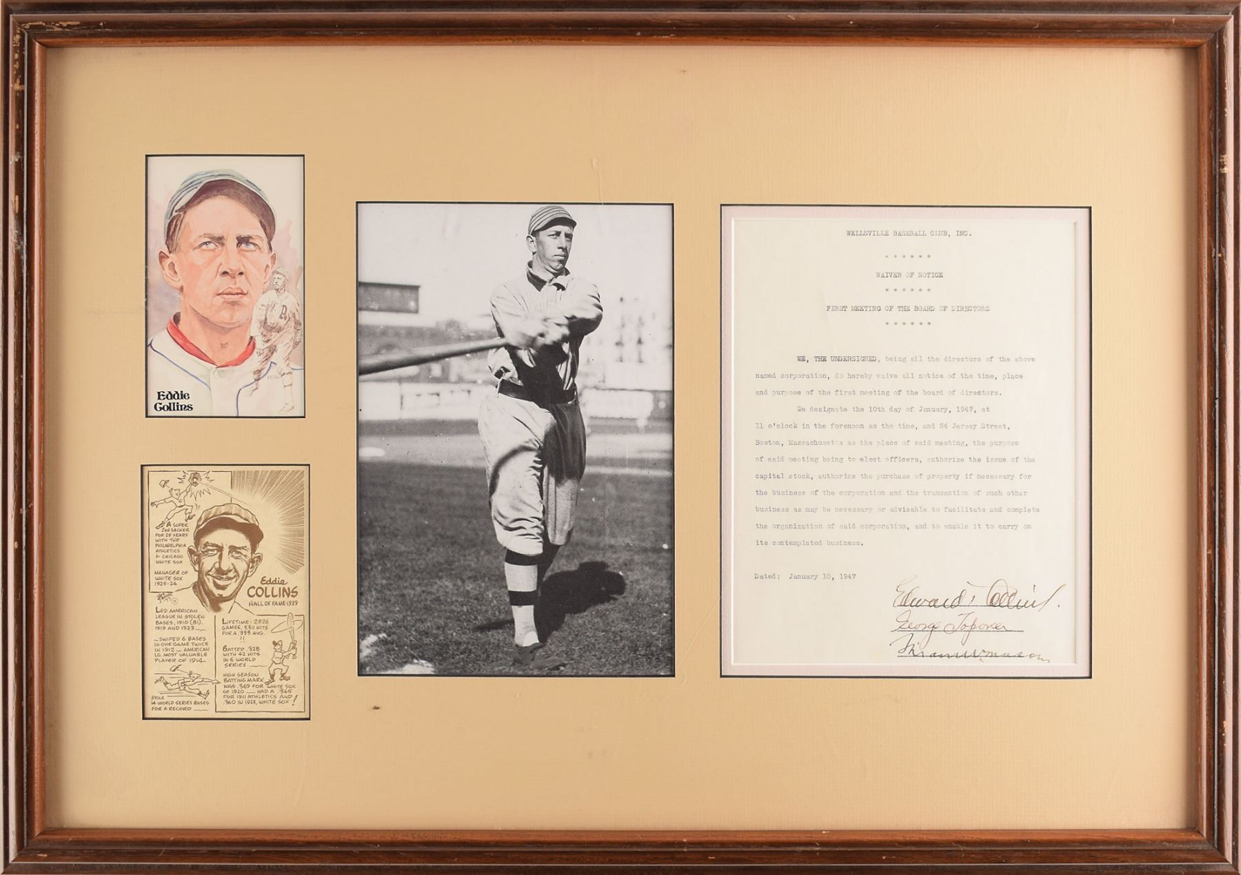 DS, signed “Edward T. Collins,” one page, 7 x 8.75, January 10, 1947. A waiver of notice from the Wellsville Baseball Club, Inc., regarding the first meeting of the board of directors, in part: "We designate the 10th day of January, 1947, at 11 o'clock in the forenoon as the time, and 24 Jersey Street, Boston, Massachusetts as the place of said meeting, the purpose of said meeting to elect officers, authorize the issue of the capital stock, authorize the purchase of property if necessary for the business of the corporation and the transaction of such other business as may be necessary or advisable to facilitate and complete the organization of said corporation, and to enable it to carry on its contemplated business." Signed at the conclusion in fountain pen by Collins. Double-matted and framed with a photo and two advertisements of Collins to an overall size of 25 x 17.75. In fine condition.